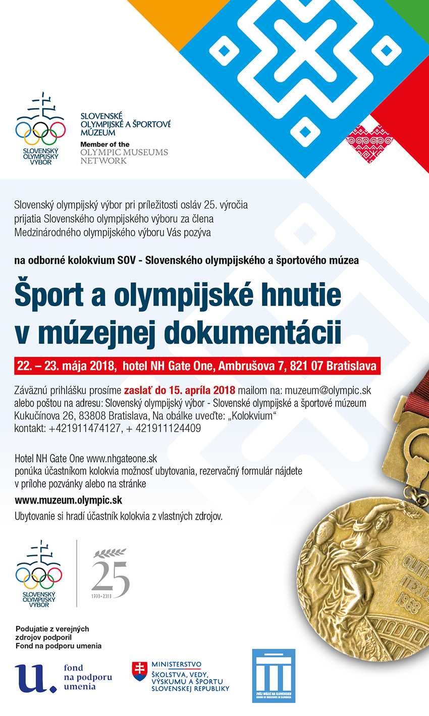 Kolokvium s medzinárodnou účasťou je podujatie celoslovenského významu, ktoré sa svojím tematickým obsahom bude organizované na Slovensku po prvý raz. Projekt SOV – Slovenského olympijského a športového múzea je zameraný na zhrnutie poznatkov SOV – SOŠM a zástupcov z partnerských múzeí zo zahraničia, smerom k jednotlivým múzeám na Slovensku , u ktorých sa predpokladá výskyt objektov a dokumentov,( resp. už ide o zdokumentované zbierkové predmety), zo športovou a olympijskou tematikou. Pokúsi sa o objasnenie a prijatie nového pohľadu na významy a hodnoty týchto zbierok v systéme kultúrneho dedičstva na Slovensku. Zo zahraničia potvrdili účasť aj prednesenie odborných príspevkov zástupcovia Oddelenia športu HM NM Praha, Olympijského múzea v Lillehammeri, Múzea športu a turistiky vo Varšave, Maďarského olympijského a športového múzea v Budapešti a Olympijského múzea v Lausanne. Zároveň organizátor očakáva spätnú väzbu od zúčastnených múzeí, aby získal čo najkomplexnejšiu informáciu o stave a charaktere zbierok z oblasti špecializácie organizátora projektu, ktoré vznikali v procese kreovania zbierkových fondov od začiatku 20.storočia, najmä však po vzniku 1. ČSR. Častokrát bez jasného pomenovania a zaradenia zbierkového predmetu, ktorý je v jednotlivých múzeách uchovávaný a často nesprávne zaradený k menej významným z hľadiska zamerania a špecializácie konkrétneho múzea. Tieto informácie chce SOV – SOŠM využiť najmä v procese prípravy a realizácie svojej stálej expozície. Zámerom projektuje je oboznámiť odbornú múzejnú verejnosť s pôsobením, postavením v a úlohami Slovenského olympijského výboru ktoré aj prostredníctvom SOV -SOŠM plní v Slovenskej republike. Projekt je jednou z hlavných odborných aktivít v rámci osláv 25. výročia založenia SOV(19.12.1992) a prijatia do Medzinárodného olympijského výboru (24.9.1993). Časť odborných príspevkov bude zameraná aj na otázky vzťahu a spolupráce neziskového sektora (SOV) a samospráv (miestne, mestské, regionálne múzea) pri tvorbe siení slávy športu a olympijského hnutia v regiónoch, dočasných výstav alebo pri dopĺňaní stálych expozícií múzeí o oblasť športu a olympijského hnutia. Cieľ kolokvia je dať impulz k naštartovaniu novej spolupráce v oblasti prehodnotenia, spravovania a uchovávania zbierok ako aj podnetom k zvýšenej aktivite vo vedecko -výskumnej činnosti z oblasti športu a olympijského hnutia v múzeách SR. Zároveň má za úlohu získať prehľad o uložení zbierok so športovou tematikou v slovenských múzeách a ich stupni spracovania v jednotlivých múzeách, predstaviť proces tvorby zbierkového fondu v SOV -SOŠM, smerom k príprave stálej expozície, pripraviť koncepciu celoslovenskej databázy zbierok so športovou a olympijskou problematikou, pripomenúť si 100 rokov od vzniku I. ČSR s väzbami na historické míľniky v športe na Slovensku a 25. výročie existencie SOV.