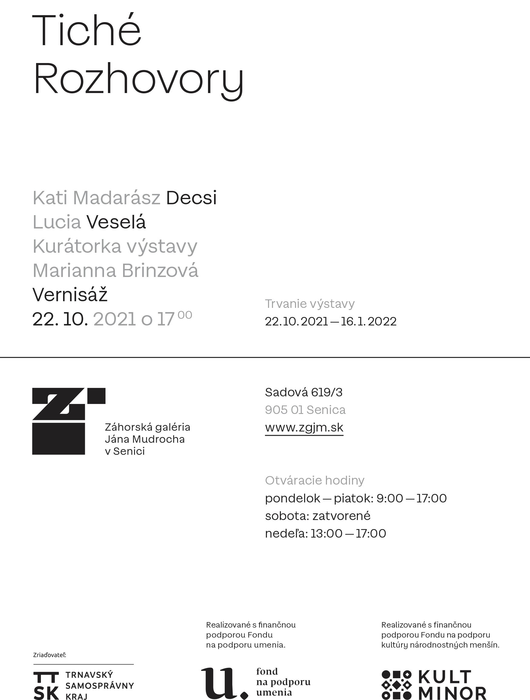 Tiché rozhovory je spoločný autorský projekt Kati Madarász Decsi (*1982) a Lucie Veselej (*1985) vytvorený pre Záhorskú galériu Jána Mudrocha v Senici na základe príbuznosti ich aktuálnej i staršej tvorby. Autorky, ktoré sa donedávna osobne veľmi nepoznali, minulý rok absolvovali spoločnú výstavu v bratislavskej Flatgallery, kde nadviazali dialóg. Tento dialóg pretrval, ale stal sa skôr tichým, založeným na empatii autoriek, podobnosti ich rozmýšľania a vnímania okolitej reality. Z ich kolaborácie a vciťovania sa akosi prirodzene vyplynulo, že nie je nutné sústreďovať sa na konkrétne autorstvo, čím sa diela v rámci expozície výstavy mohli organicky previazať.