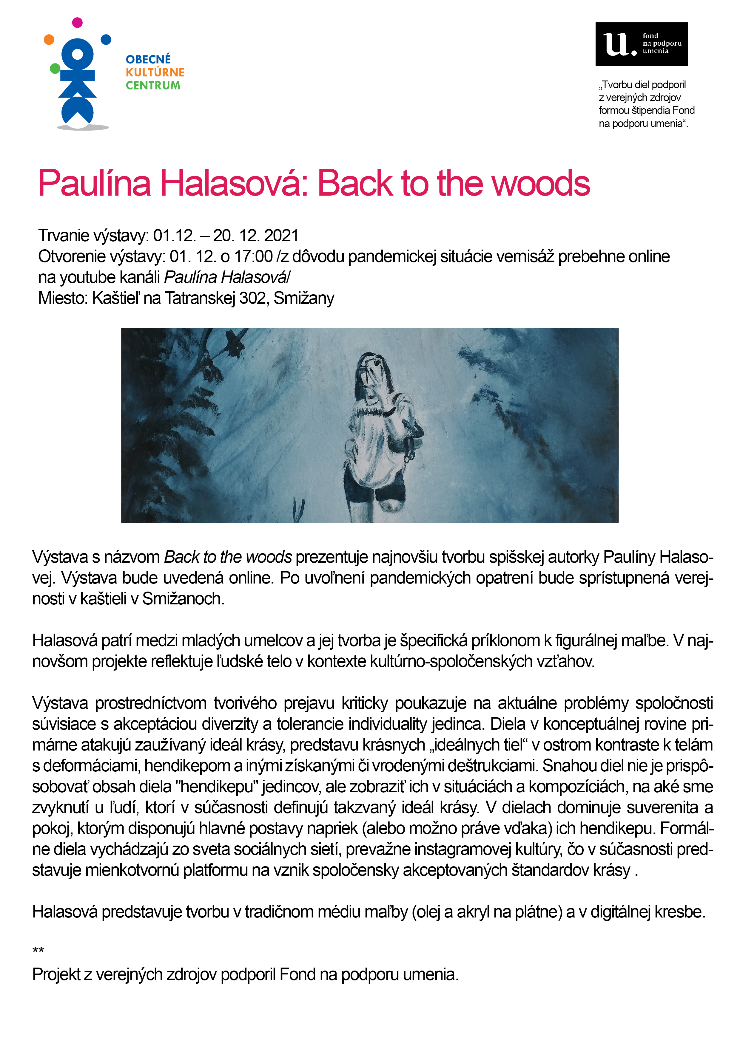 Výstava s názvom Back to the woods prezentuje najnovšiu tvorbu spišskej autorky Paulíny Halasovej. Výstava bude uvedená online. Po uvoľnení pandemických opatrení bude sprístupnená verejnosti v kaštieli v Smižanoch.
