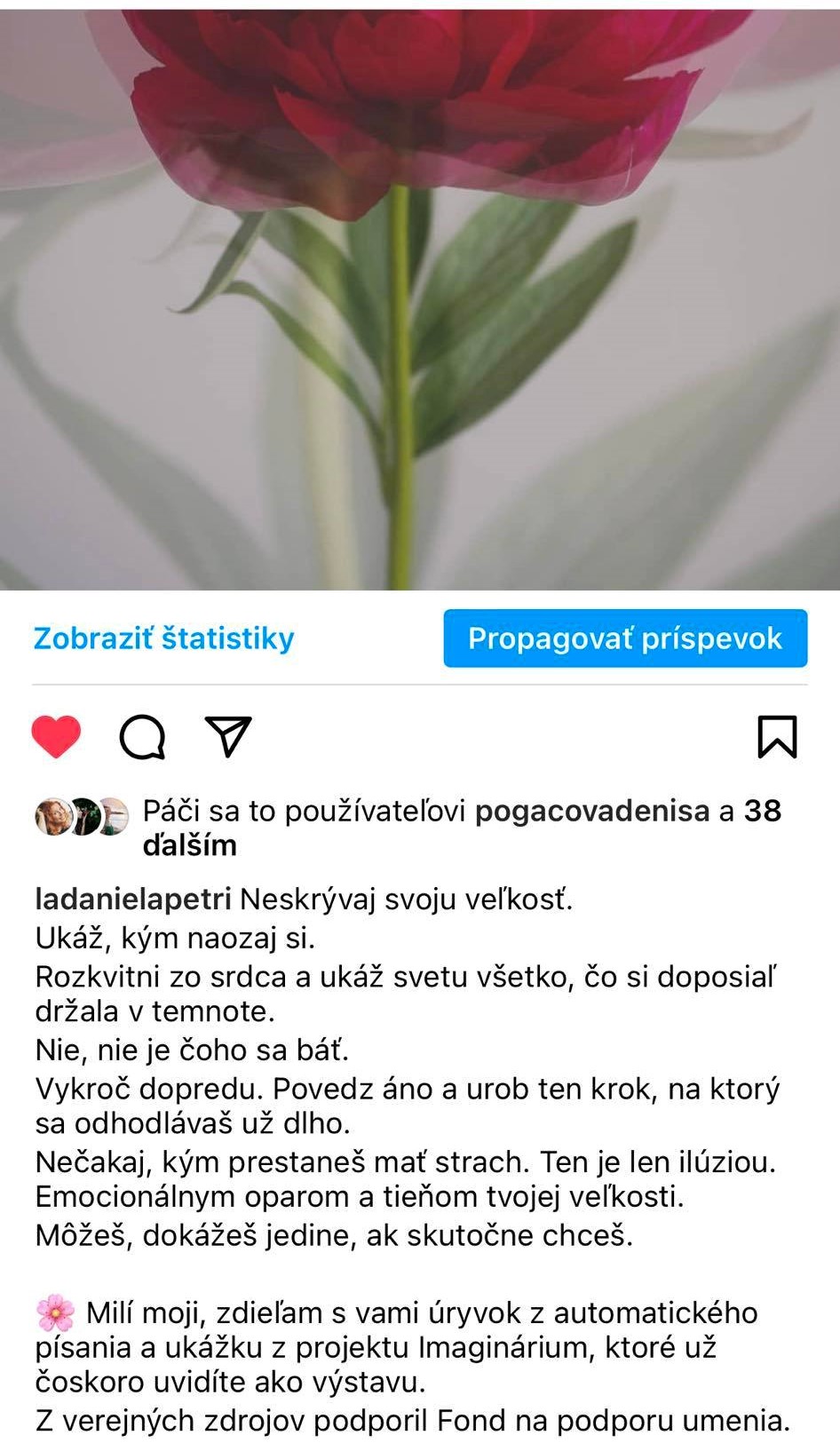 Projekt Imaginárium som realizovala od jari do leta, v uvedenom termíne. Išlo o sériu autoportrétnych fotografíí s kvetinami, ktoré so zámerom vyvolať estetický a éterický zážitok. Fotografie prešli silnou postprodukciou, v ktorej som vytvárala efekty nežnosti, jemnosti, ladila farby a dotvárala atmosféru. Projekt Imaginárium som promovala na sociálnych sieťach - Facebook a Instagram, následne som sputila reklamu na výstavu na sociálnej sieti Facebook. Všetky propagačné aktivity boli v súlade s podmienkami a použitím textu, že tento projekt vznikol s podporou FPU.