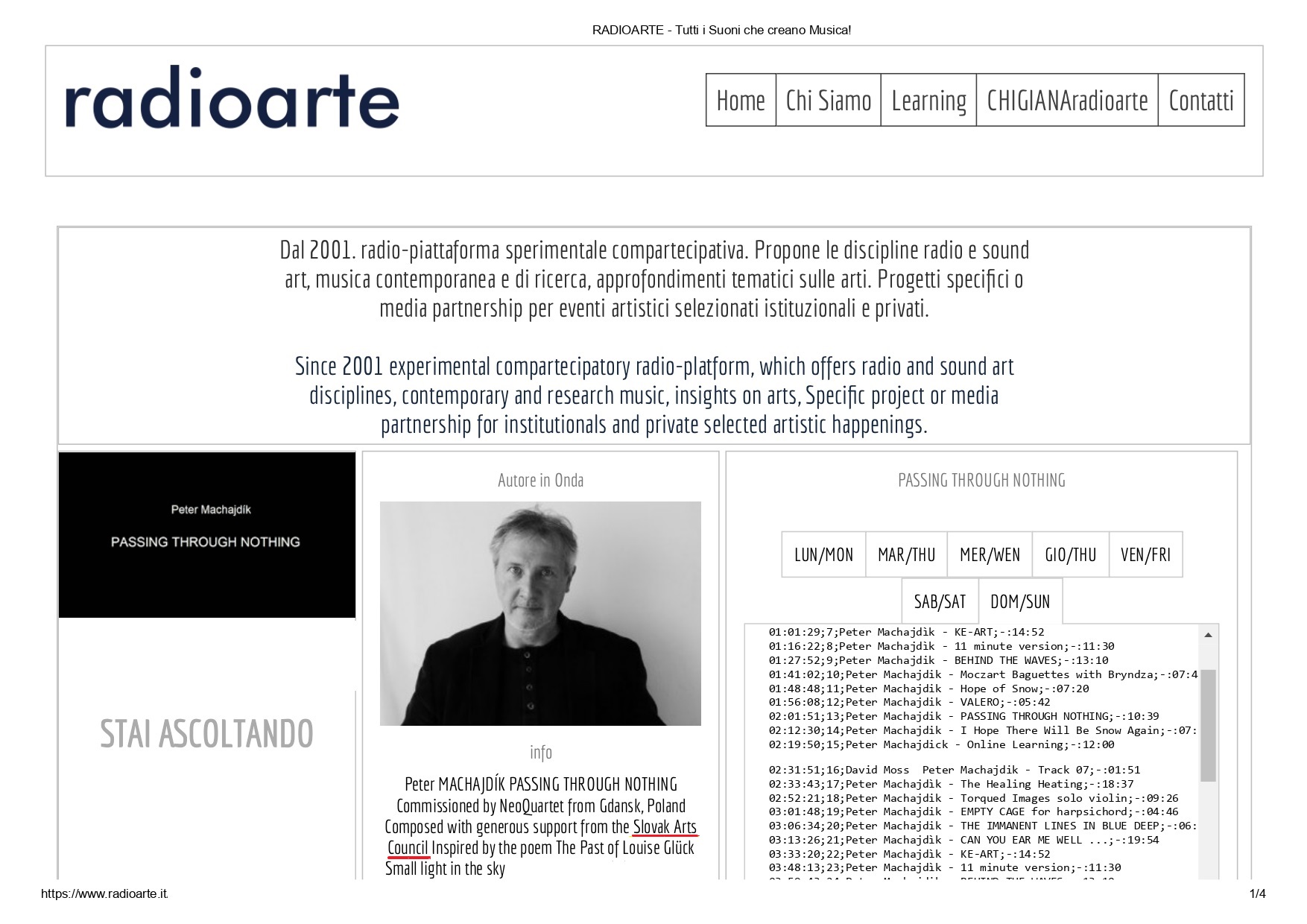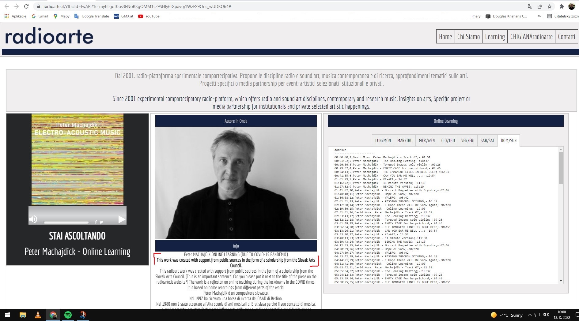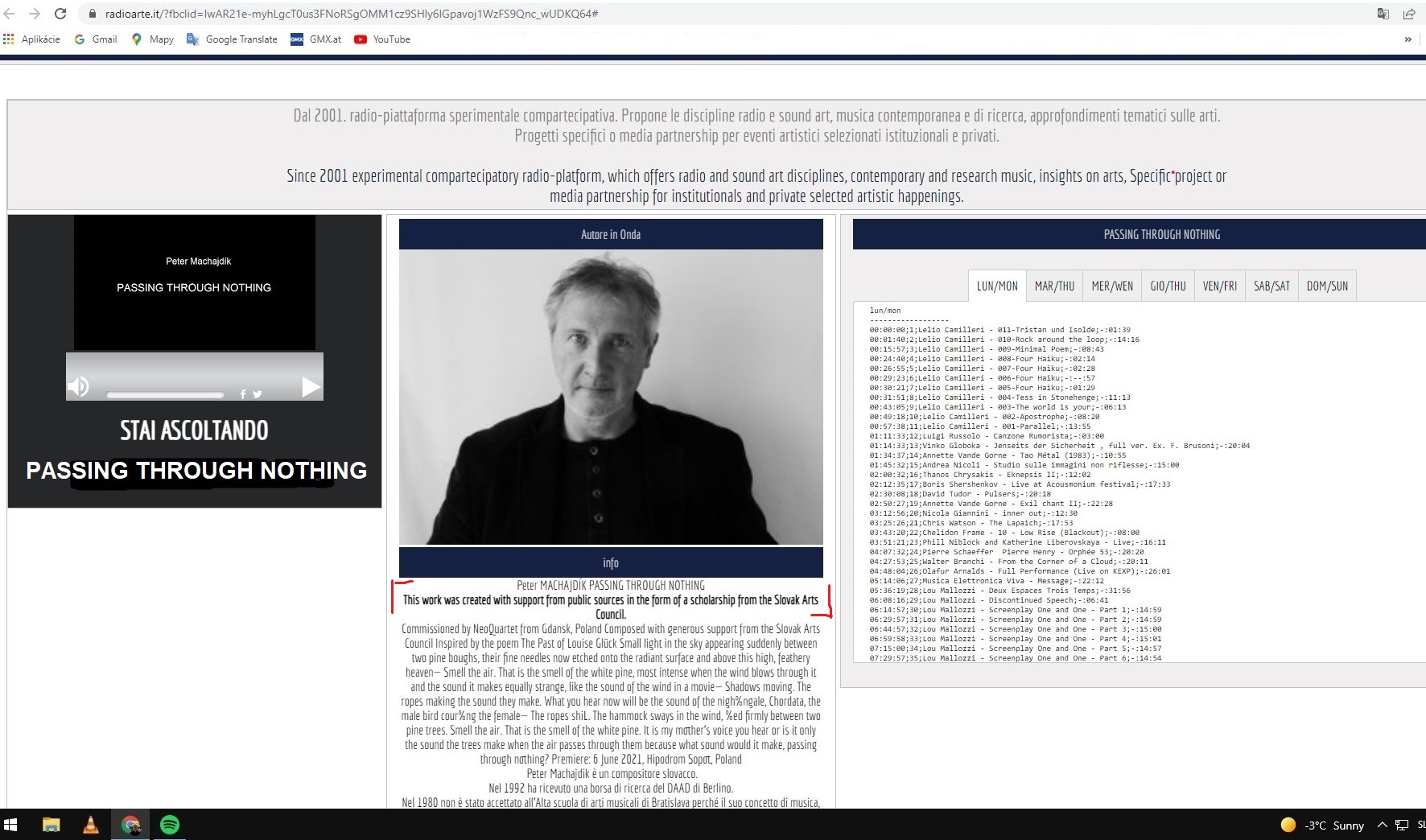 Súčasťou tohto programu je aj prezentácia skladby PASSING THROUGH MOTHING, ktorej napísanie rovnako ako aj realizáciu radio-artovej kompozície ONLINE LEARNING (DUE TO COVID-19 PANDEMIC) podporil z verejných zdrojov formou štipendia Fond na podporu umenia.