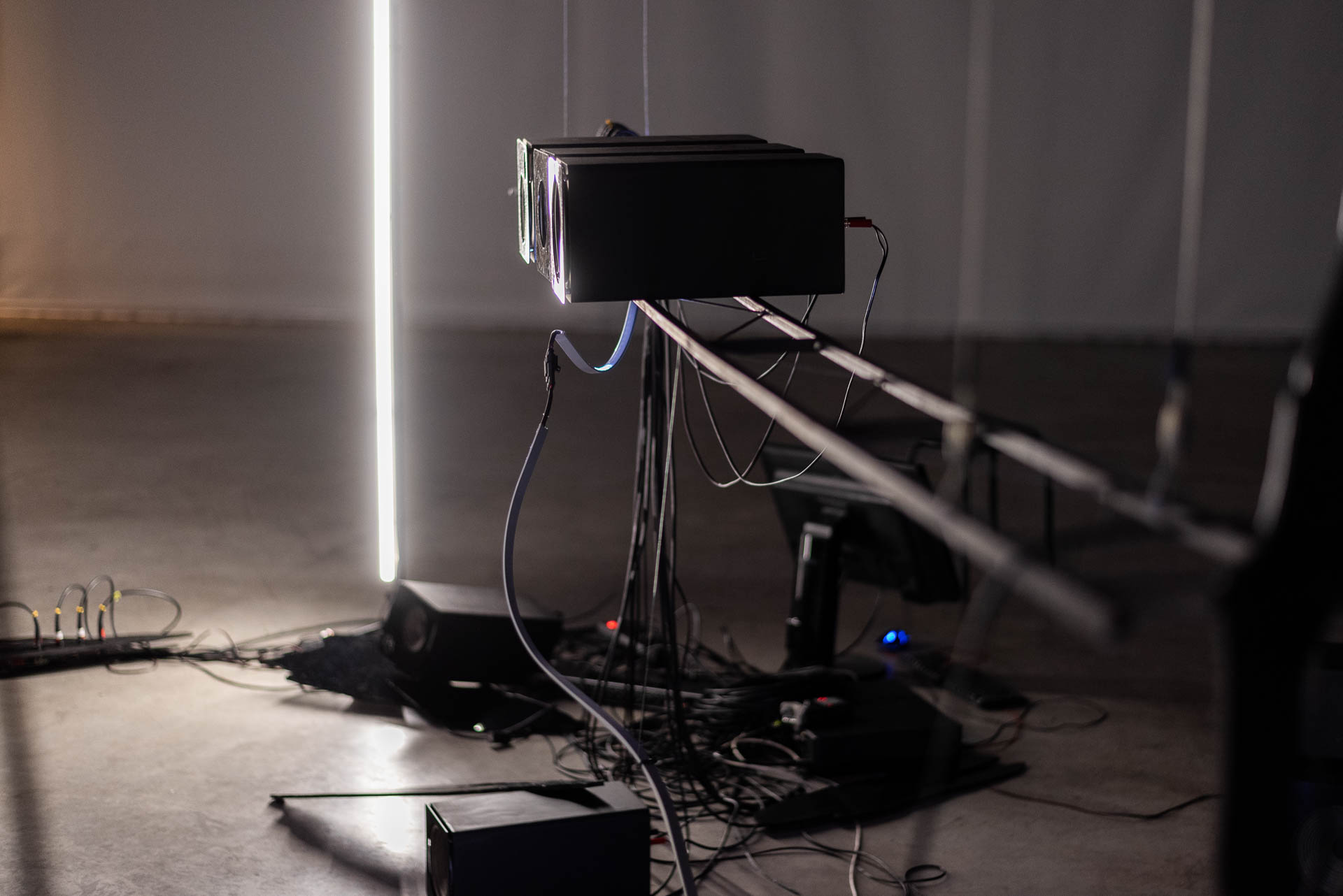 Edge of Choas je hypotetický fyzikálny stav, kedy entropia - náhodná distribúcia elementov - dosahuje maximálnych hodnôt. Práve v tomto momente je podľa tejto hypotézy systém najplodnejší a najkreatívnejší. Nachádza sa v stave, kedy môže transmutovať do rôzonorakých foriem a prevážiť môžu rozličné dynamiky. Vhodnou metaforou pre takýto stav je feedback (odozva), teda stav, v ktorom vstup do systému sa stáva jeho výstupom a naopak. Tento efekt je v zvukovom umení často využívaný a estetizovaný, no má i svoje politické a planetárne presahy. V diele som chcel vytvoriť žitú, imerzívnu dynamiku, ktorá by takýto stav stelesňovala a umožniť tak publiku toto zakúsiť a taktiež potencionálne pozemniť. Dielo pozostáva z 18 vlastnoručne vyrobených reproduktorov, mikrofónov a z 20 metrov LED páskov, ktoré vizualizujú a sonifikujú túto komplexnú, ryzomatickú dynamiku.