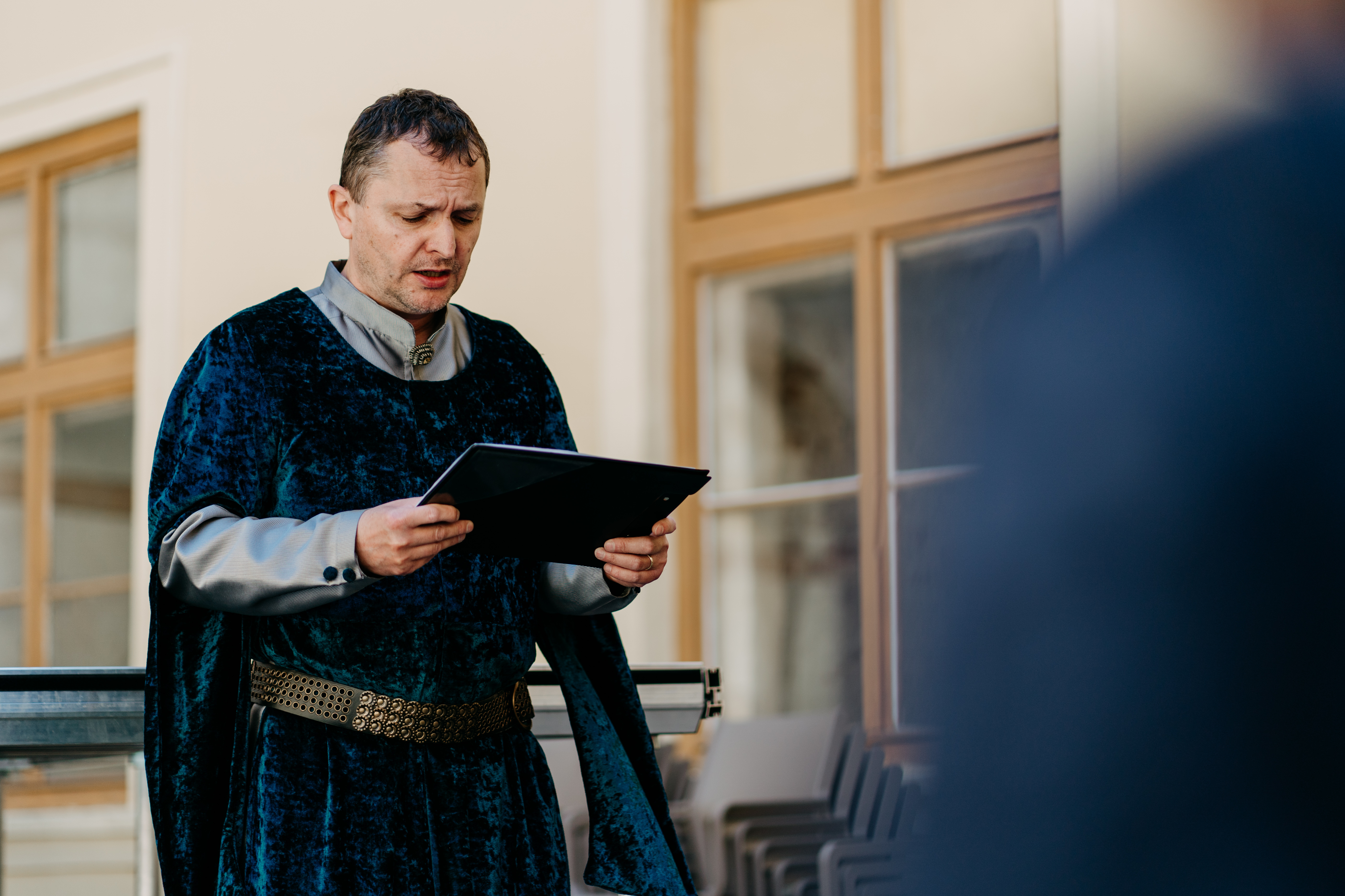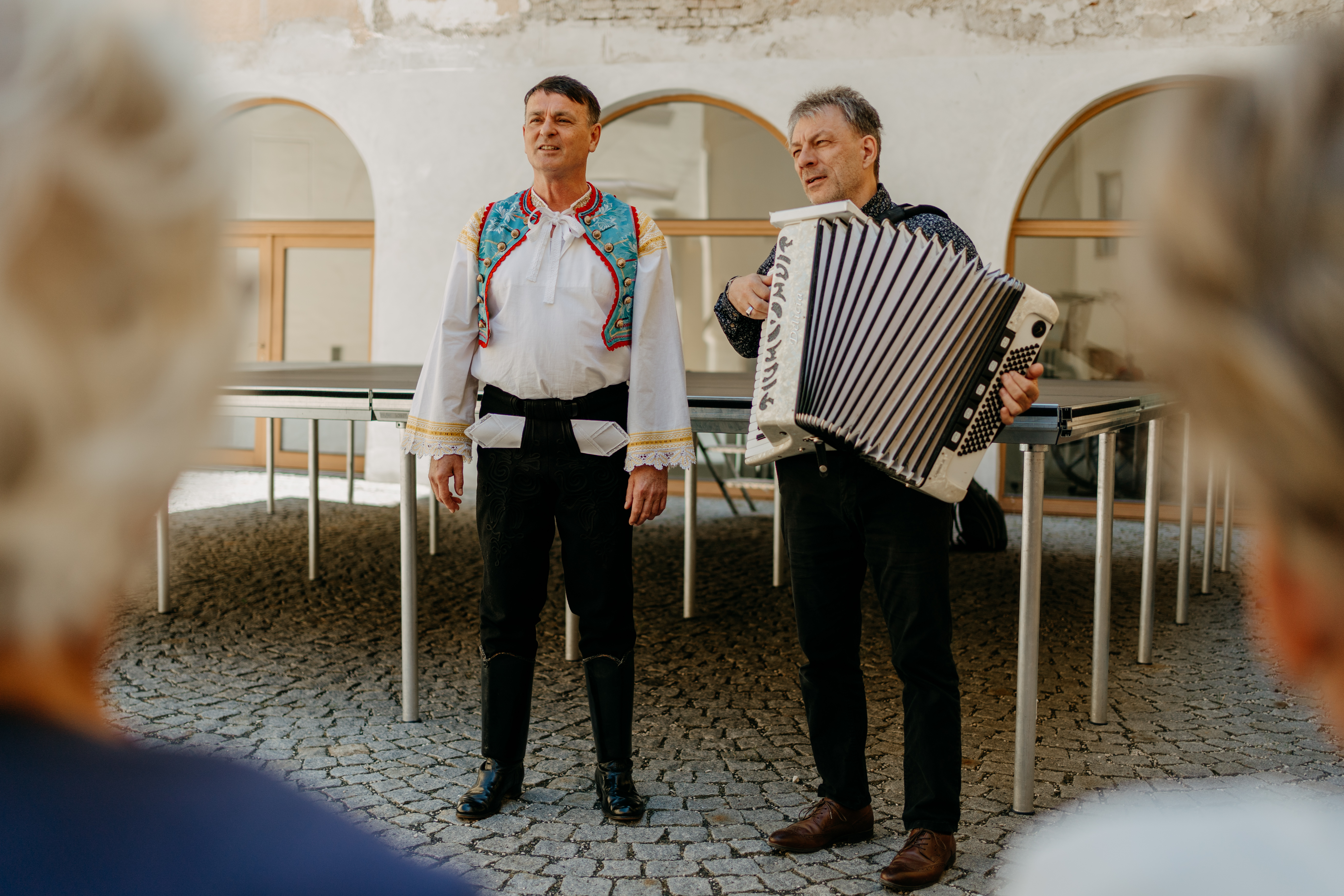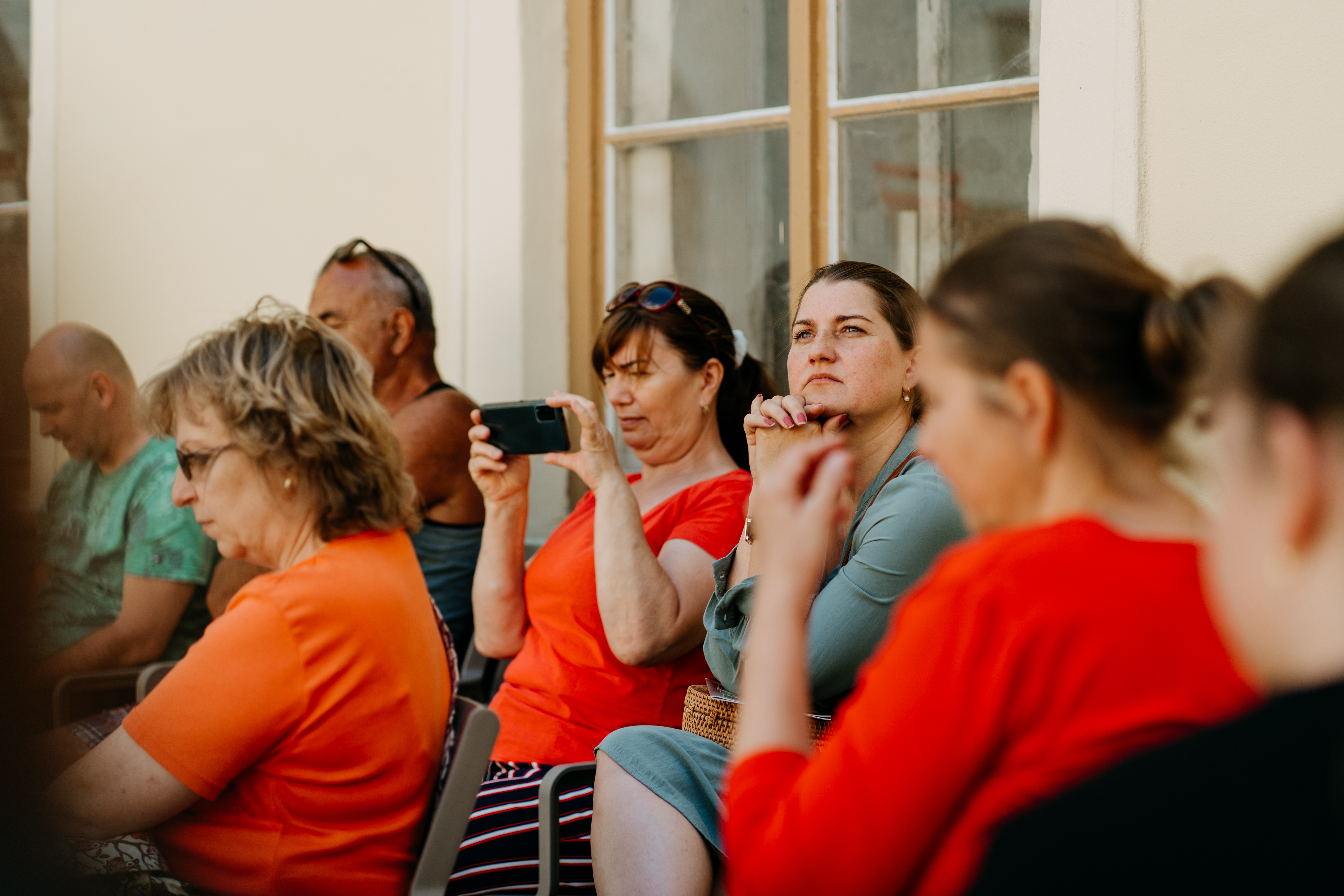 Poslednou zastávkou nášho putovania bolo nádvorie zámku v Hlohovci, kde odznela historická povesť o hlohovských obrancoch v spracovaní českého autora Františka Juru. Prečítal nám ju Roman Drgoň. Dramatické udalosti z povesti uzavrel spevom regrútskych piesní Ján Bielik, na harmonike ho sprevádzal Robo Schaller.