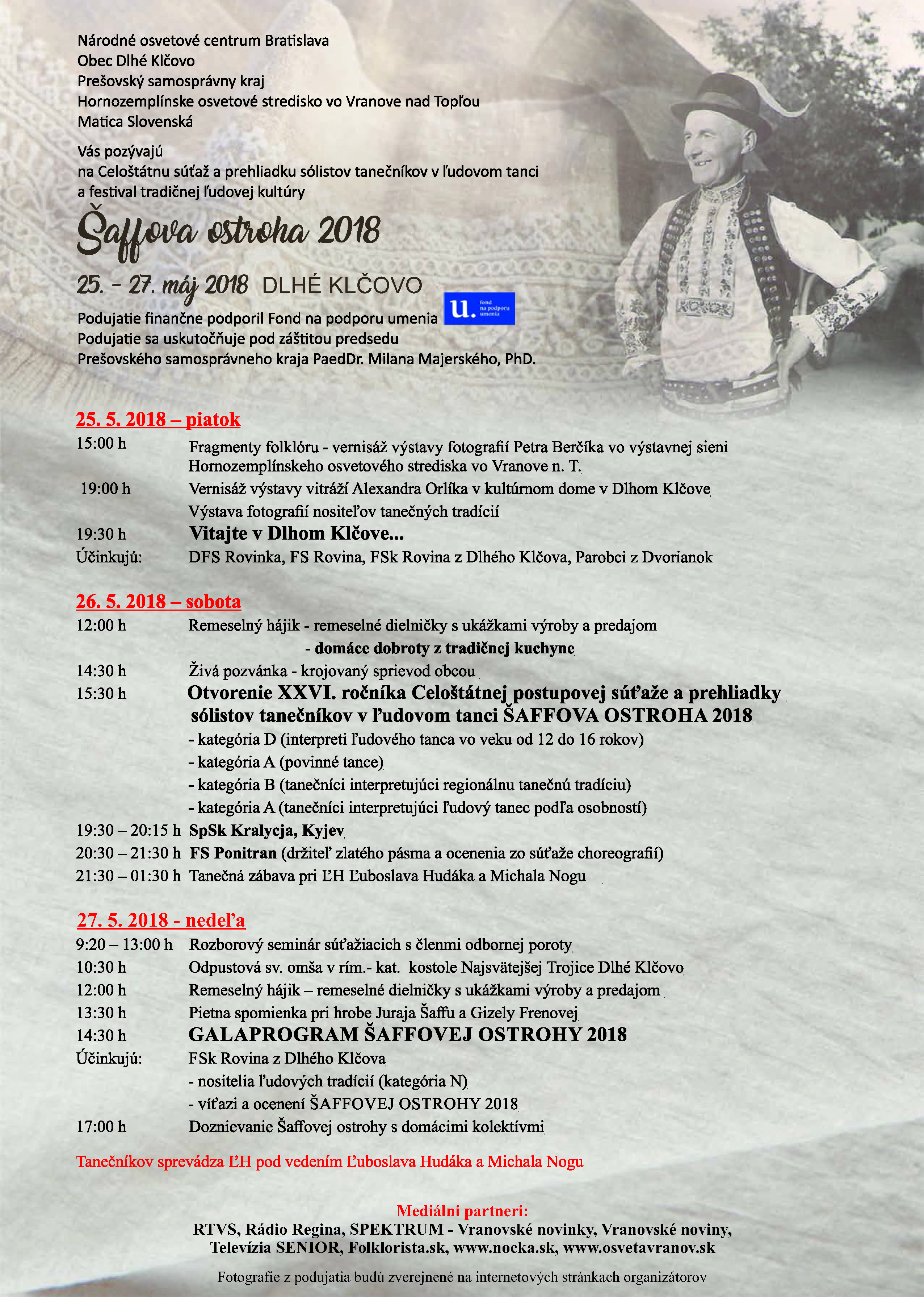Celoštátna postupová súťaž a prehliadka sólistov tanečníkov v ľudovom tanci ŠAFFOVA OSTROHA 2018 26. ročník - Festival tradičnej ľudovej kultúry