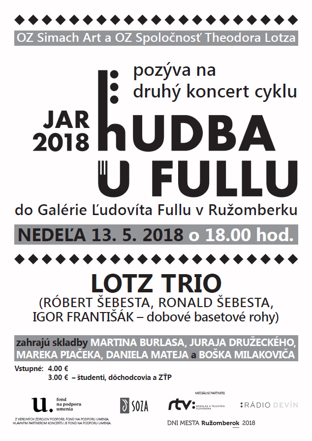 Lotz trio ( Ronald Šebesta, Róbert Šebesta, Igor Františák ‒ dobové basetové rohy ) Program: Martin Burlas: Sailing against the Night Juraj Družecký (1745 – 1819): Divertissement pour trois Cor de Basset Marek Piaček: Pustatina Daniel Matej: 3m für W. A. M. Boško Milakovič: The Inner Singers