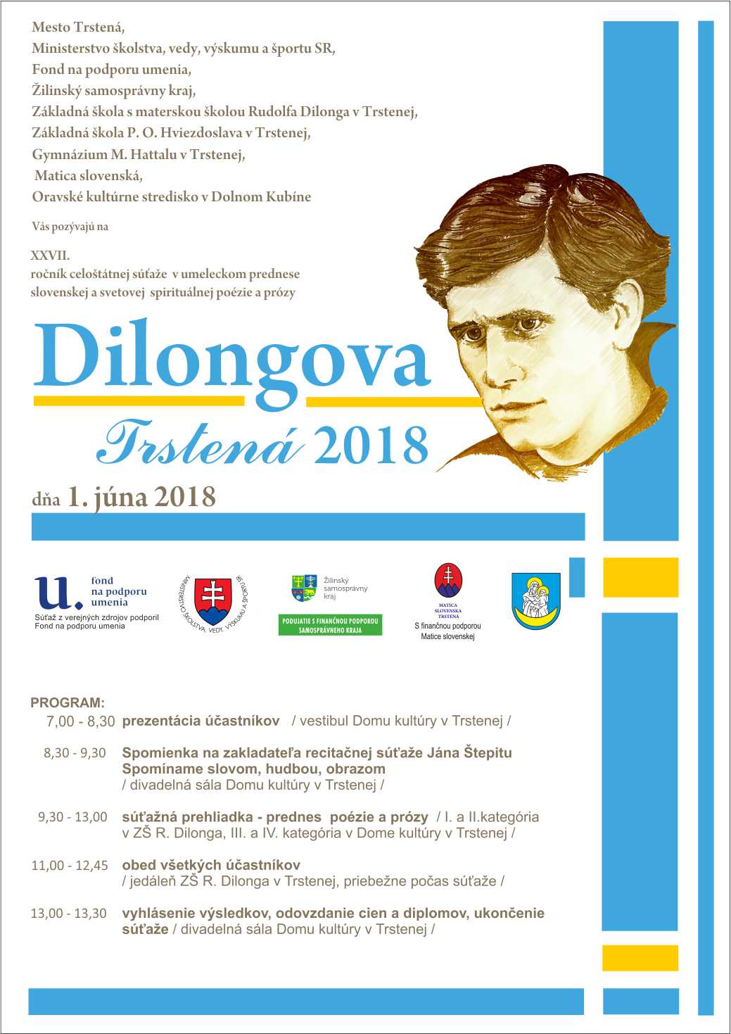 Dilongova Trstená – celonárodná recitačná súťaž v umeleckom prednese slovenskej a svetovej spirituálnej poézie a prózy – bude 1. júna 2018 opäť hostiť recitátorov z celého Slovenska. Súťaž sa koná na počesť významného trstenského rodáka, básnika, prozaika, dramatika, mnohostranného exilového spisovateľa, Rudolfa Dilonga. Rudolf Dilong sa svojou tvorbou radí medzi najvýznamnejších a najplodnejších autorov katolíckej moderny. Dilongova Trstená je jednodňová nepostupová súťaž. V roku 2018 sa uskutoční už dvadsiaty siedmykrát. Recitátori súťažia v štyroch kategóriách, poézia zvlášť, próza zvlášť. Recitačná súťaž prebieha v Dome kultúry v Trstenej a ZŠ s MŠ R. Dilonga v Trstenej. Súťaž výrazne prispieva k vyhľadávaniu talentovaných a nadaných žiakov a študentov v oblasti umeleckého slova, vedie ich k samostatnej tvorivej činnosti, upevňuje ich záujem o sebavzdelávanie, prispieva k účelnému využívaniu voľného času, vytvára podmienky pre úspešnú prezentáciu týchto aktivít v školách a na kultúrnych podujatiach.