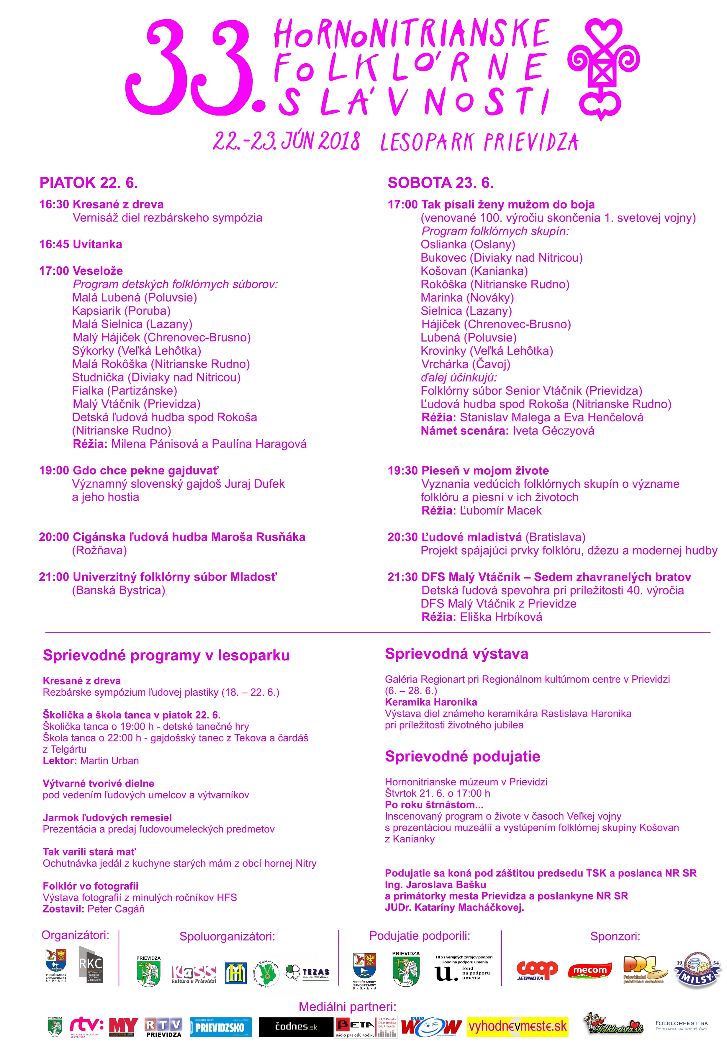 Časť z tohto bohatstva môžete objaviť na našom hornonitrianskom festivale folklóru a ľudovej kultúry, ktorý vstúpi už do svojho 33. ročníka v dňoch 22. – 23. júna 2018 v prievidzskom lesoparku. Jeho hlavným organizátorom je Regionálne kultúrne centrum v Prievidzi. Aj v tomto ročníku tematicky prepájame vystúpenie folklórnych skupín a súborov z hornej Nitry s komorným programom, ktorý pripravuje Hornonitrianske múzeum v Prievidzi. V oboch si pripomenieme 100. výročie ukončenia prvej svetovej vojny.