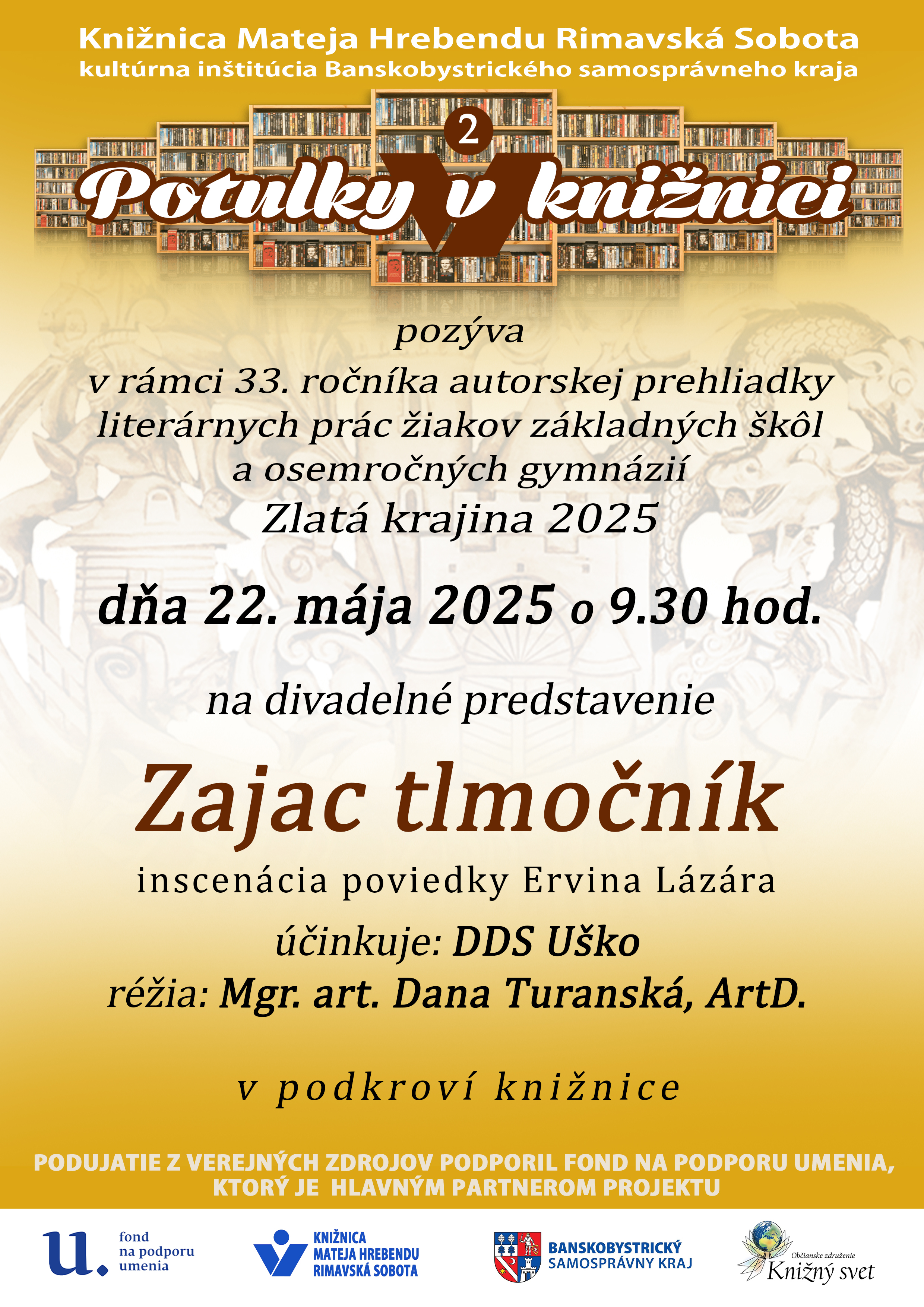 Slávnostné otvorenie literárnej prehliadky Zlatá krajina sa uskutoční dňa 22. 5. 2025 so začiatkom o 9,30 hod. za účasti detských literátov a hodnotiteľov literárnych prác. Zlatú krajinu otvárame divadelným predstavením Zaja tlmočník v podaní DDS Uško.
