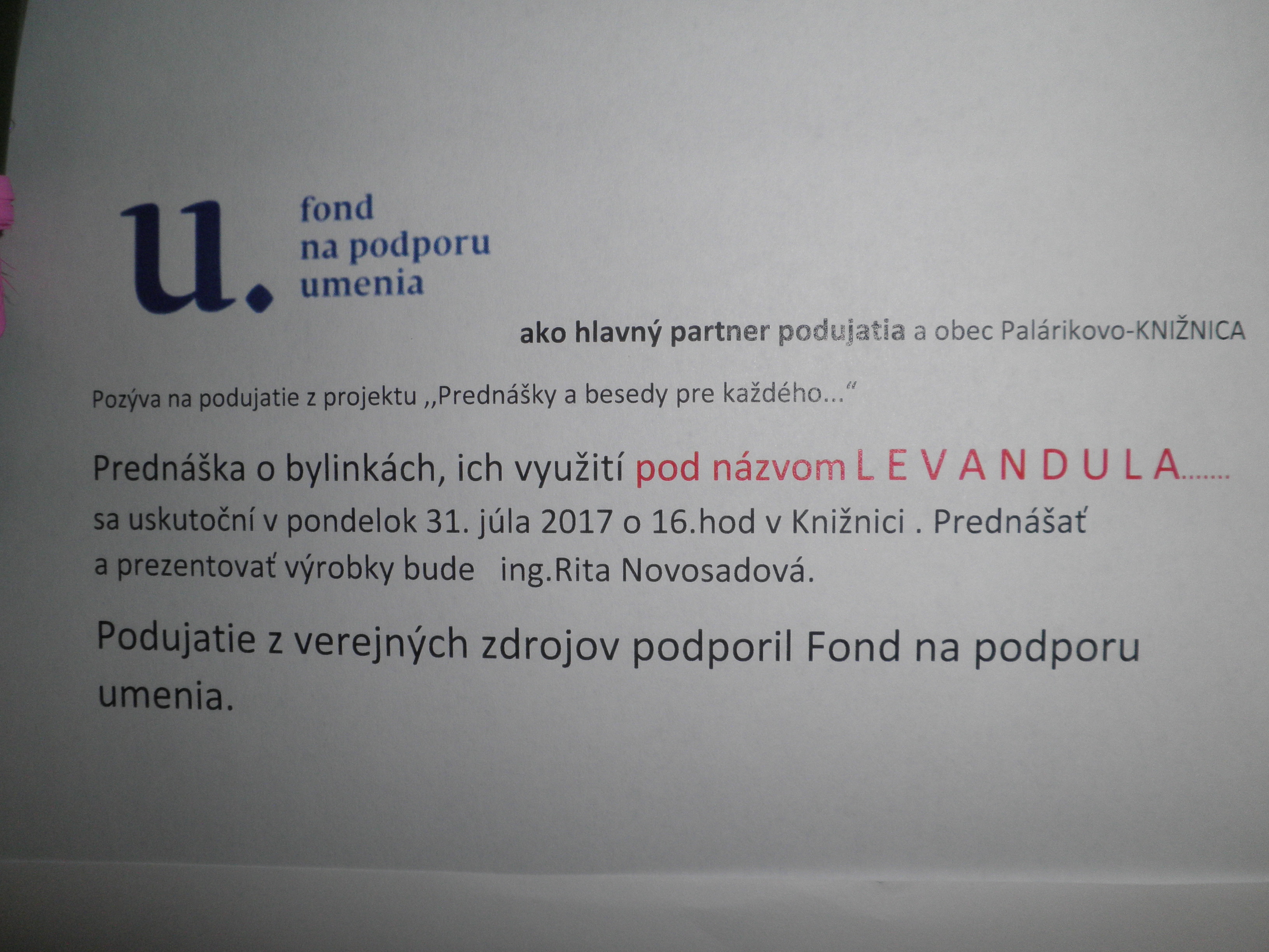 Fond na podporu umenia ako hlavný partner podujatia a obec Palárikovo-KNIŽNICA pozýva na podujatie z projektu,,Prednášky a besedy pre každého...!Prednáška o bylinkách, ich využití pod názvom LEVANDULA... sa uskutoční v pondelok 31. júla o 16. hod v Knižnici. Prednášať a prezentovať výrobky bude ing. Rita Novosadová- známa aj z televíznej obrazovky. Podujatie z verejných zdrojov podporil Fond na podporu umenia.