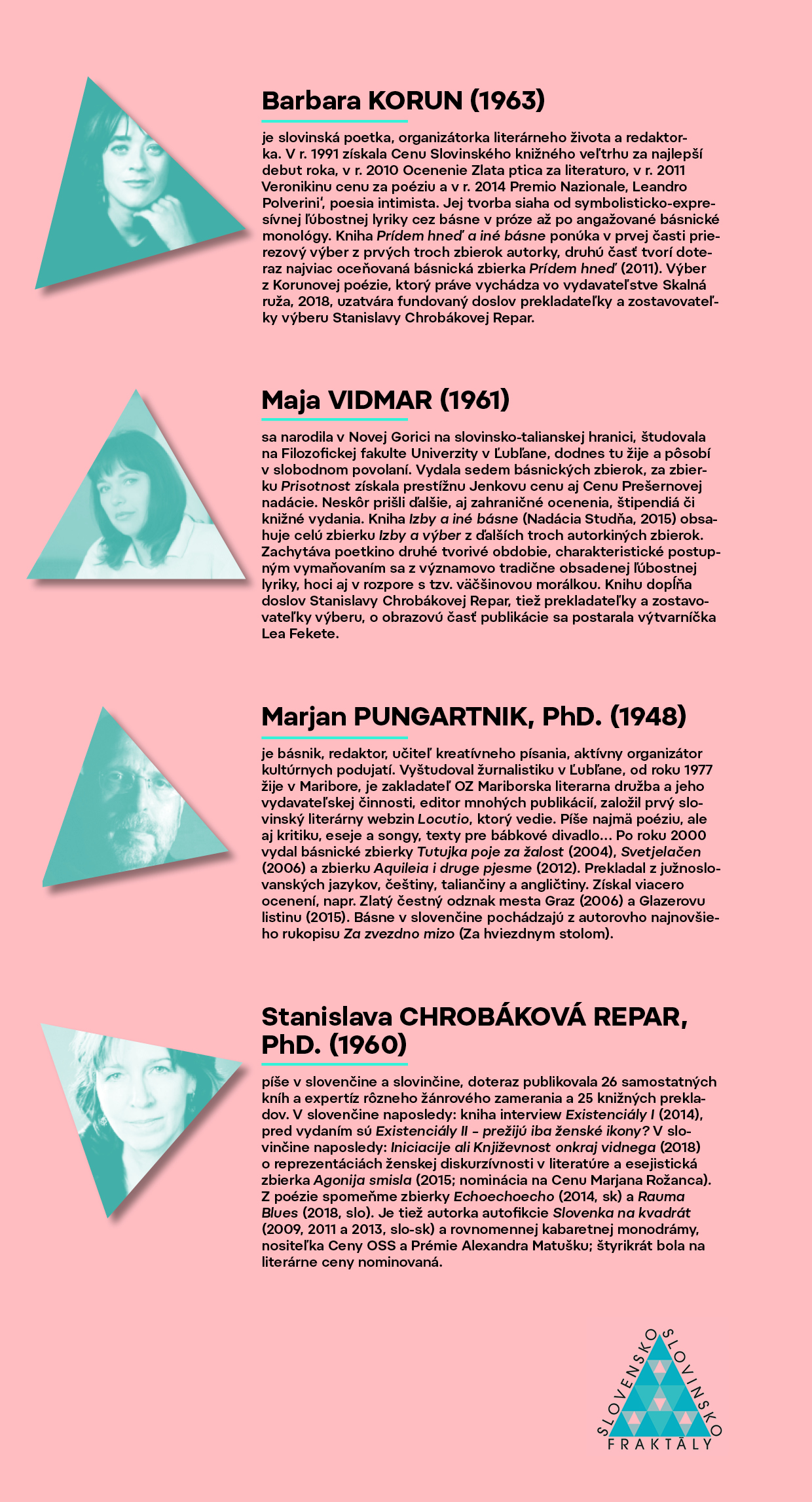 V slovenskej časti 2. ročníka „Fraktály SK/SI“ predstavujeme publiku v Bratislave, Liptovskom Mikuláši a Ružomberku dve slovinské poetky Maju Vidmar (1961) a Barbaru Korun (1963). Prekladateľkou ich poézie je Stanislava Chrobáková Repar, slovenský výber z poézie M. Vidmar vyšiel v Nadácii Studňa v r. 2015, výber z poézie B. Korun vychádza v r. 2018 vo vydavateľstve Skalná ruža. Tretím slovinským účastníkom je básnik, prekladateľ a autor pre deti Marjan Pungartnik (1948), riaditeľ Domu literatúry v Maribore a náš slovinský partner. Poézia slovinských hostí sa stretne na scéne aj s výtvarným umením a hudbou zo Slovenska. Fullart a KriStan sú naše tajné šifry pre to i ono...