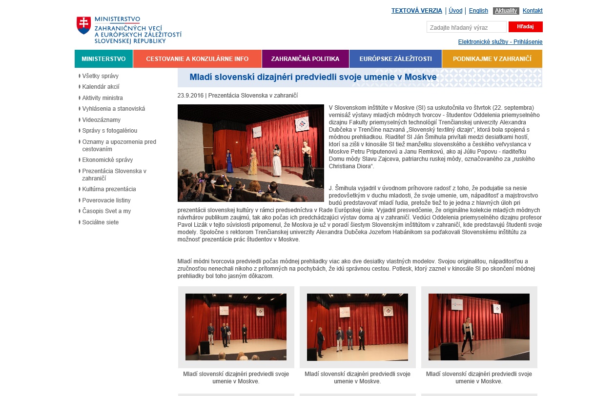 Výstava je prezentáciou prác študentov Oddelenia priemyselného dizajnu KMI FPT TnUAD, ktoré sú výsledkom dlhodobého úsilia hľadania a spracovania textilných vlákien a materiálov do konkrétnej výtvarnej a zároveň funkčnej podoby. Medzi hlavné projektové aktivity patrí podpora mladých textilných návrhárov v rámci medzinárodnej prezentácie. Cieľovými skupinami sú mladý textilný dizajnéri pôsobiaci na univerzitách v Moskve a zahraniční Slováci žijúci v Moskve a okolí.