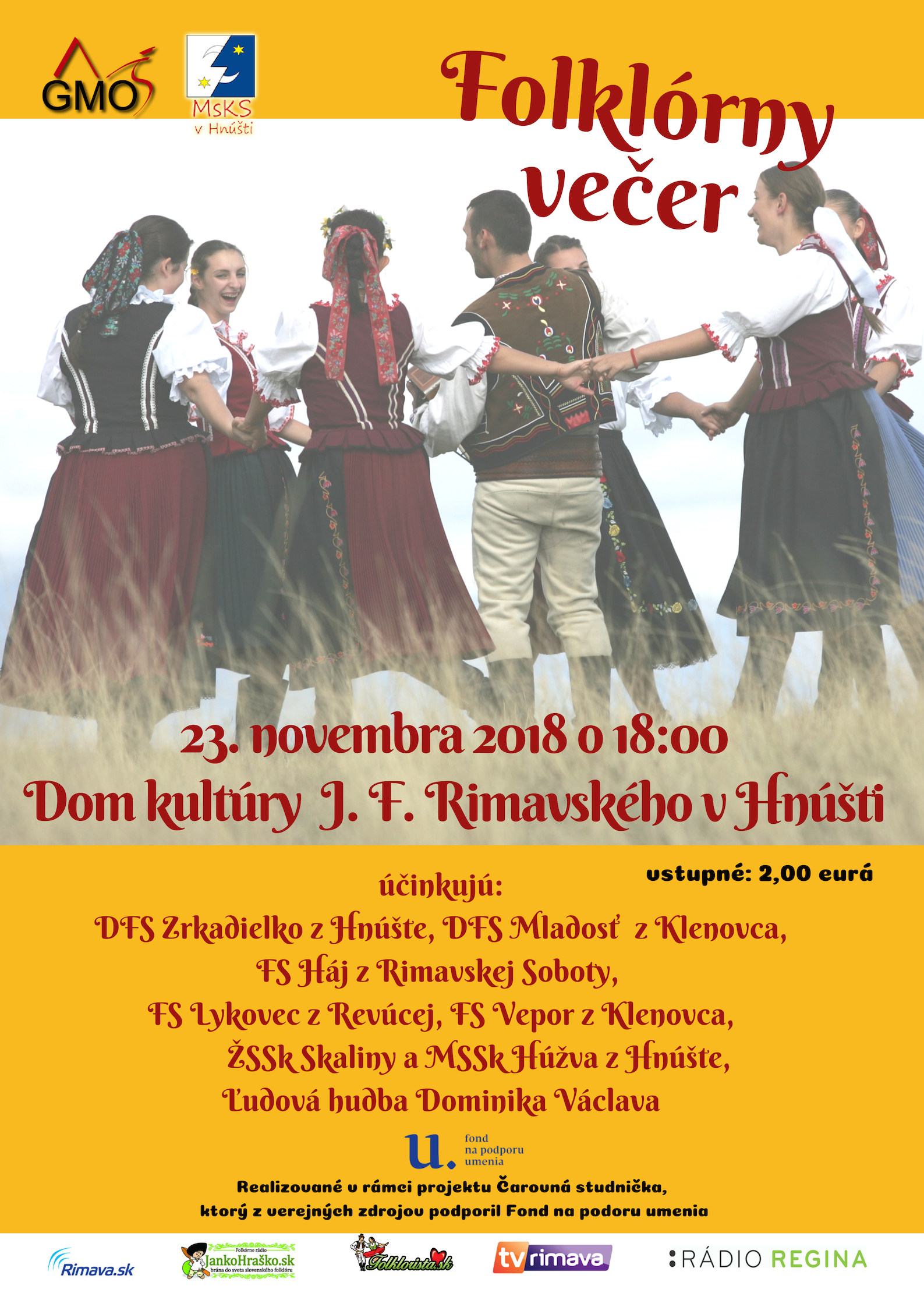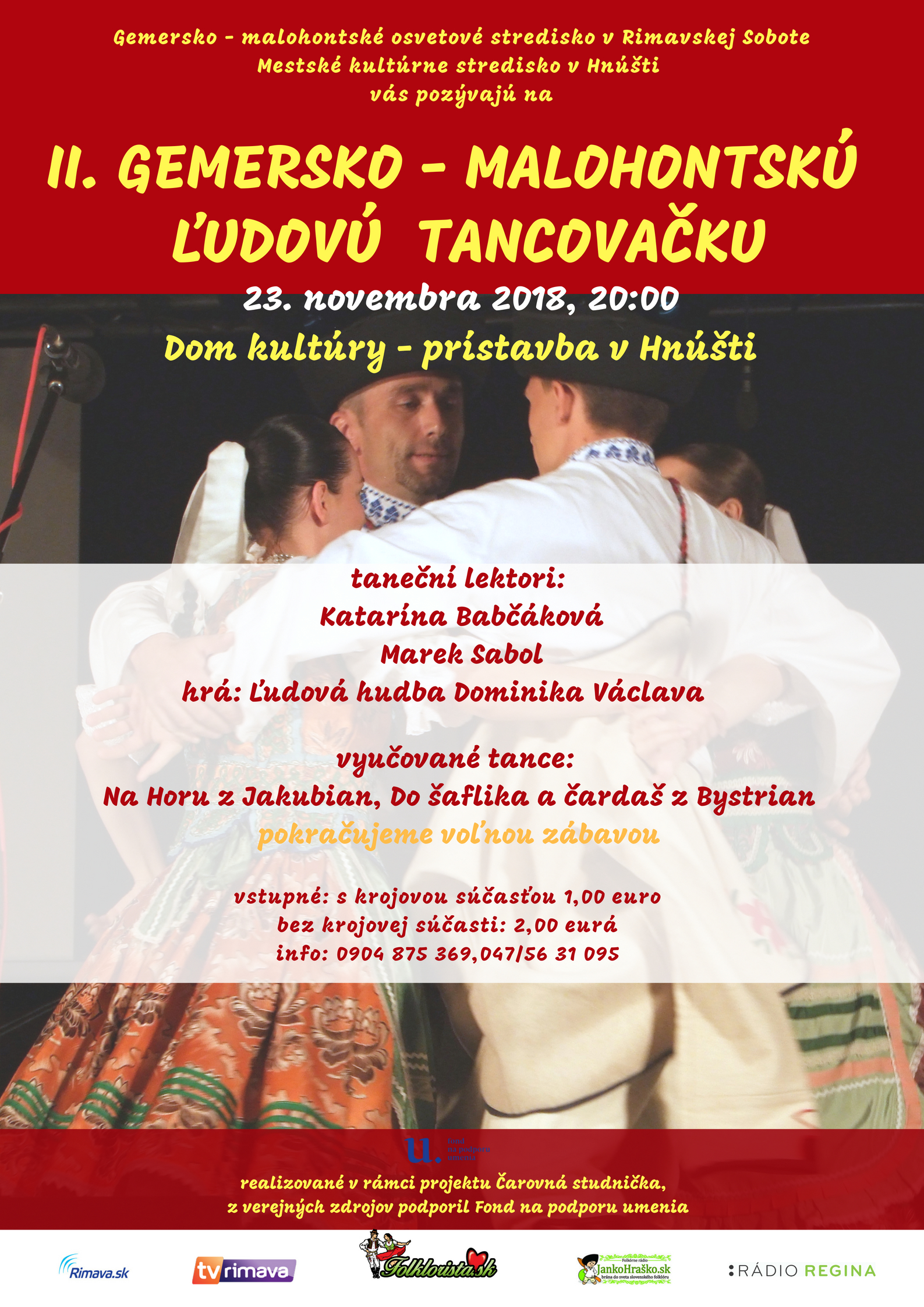 Vzdelávacie aktivity v oblasti tradičnej ľudovej kultúry, remeselné dielne, hudobné dielne, tanečné dielne, spevácke dielne, ľudový odev, pre žiakov základných škôl a osemročné gymnázium v Hnúšti, workshop pre členov FS a záujemcov o folklór na témy: hudobné tradície - prezentácia gájd, súčasť ľudové odevu - parta, výroba zápästkov. Folklórny večer - prezentácia folklórnych kolektívov z regiónu, II. Gemersko - malohontská ľudová tancovačka s tanečnou dielňou.