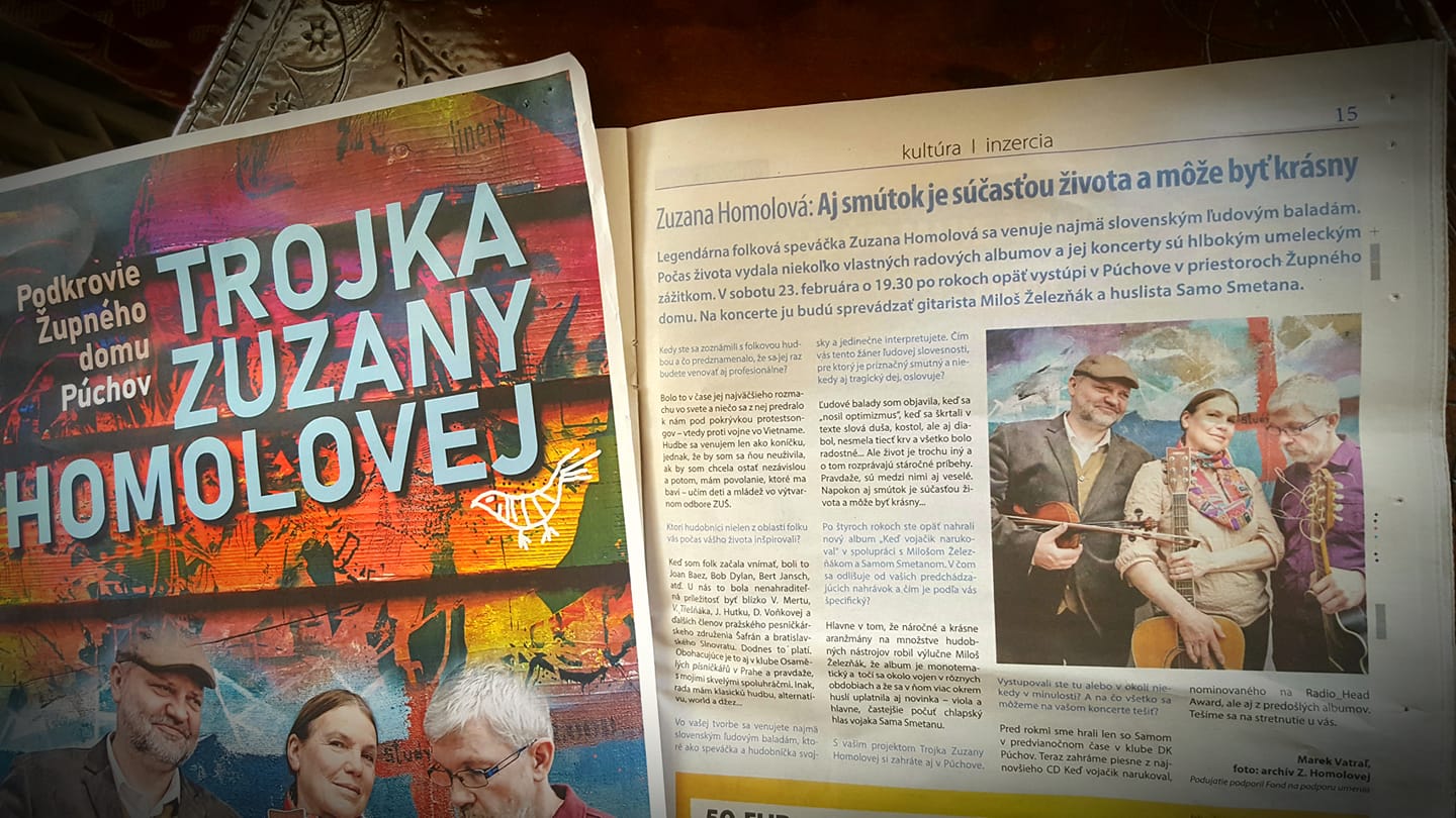 Pozývame vás na koncert legendárnej folkovej speváčky Zuzany Homolovej, ktorá sa popri ľudových baladách začala už dávno venovať aj vlastnej tvorbe a popri tom spolupracovala s významnými slovenskými, ale aj zahraničnými skladateľmi a hudobníkmi. Počas života vydala niekoľko vlastných radových albumov a jej koncerty sú sami o sebe hlbokým umeleckým zážitkom. Na koncerte ju budú sprevádzať gitarista Miloš Železňák a huslista Samo Smetana.
