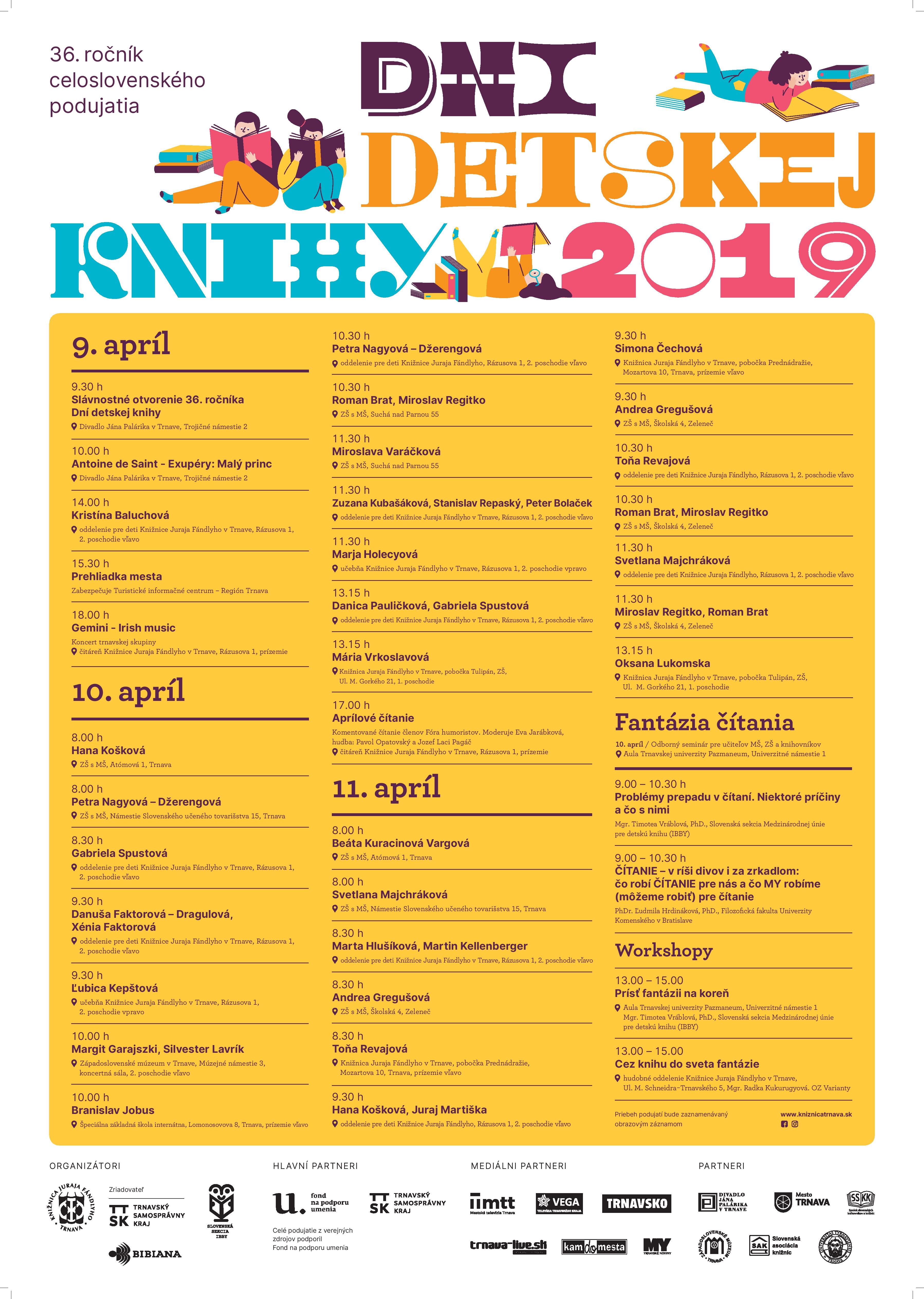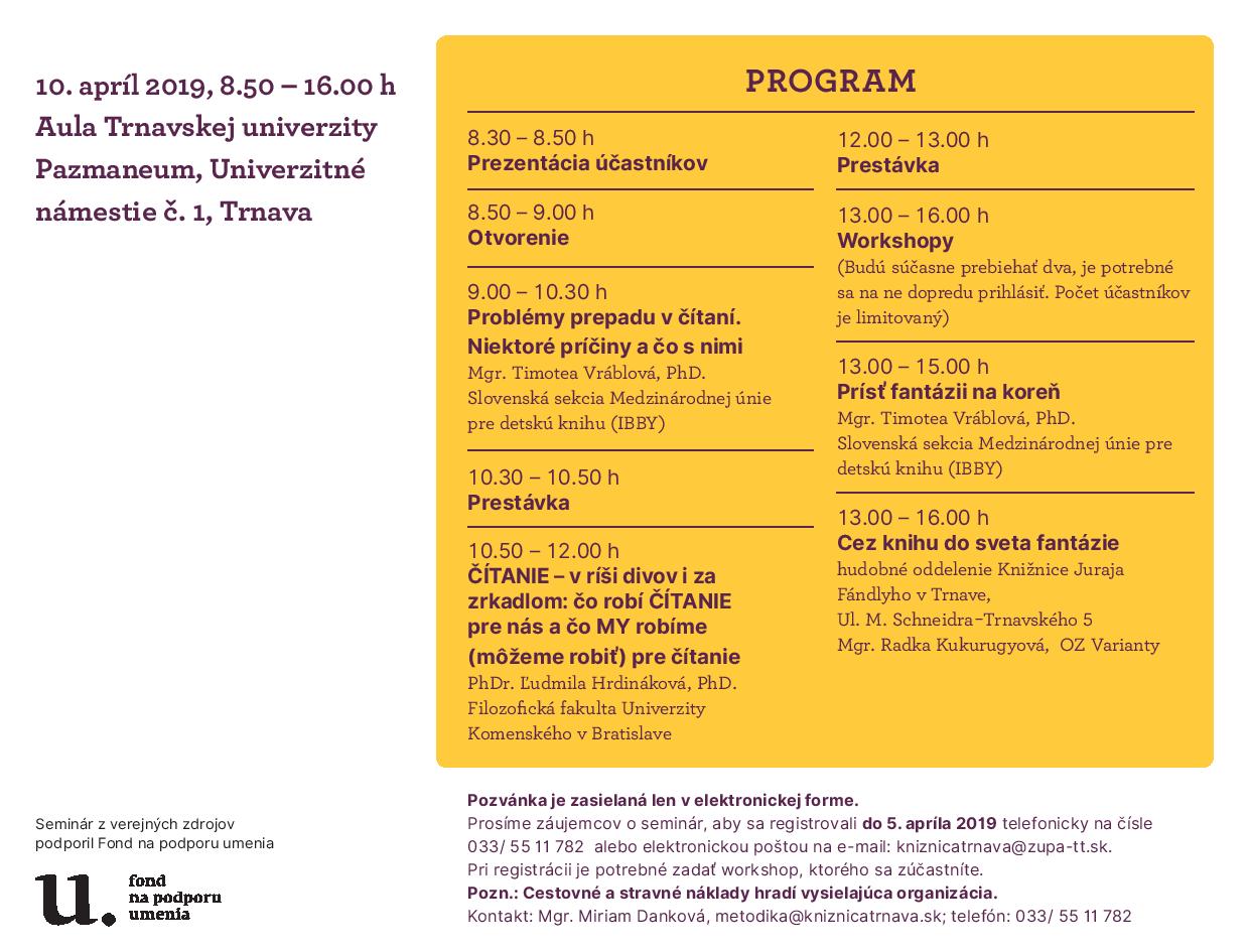 Súčasťou tohto trojdňového maratónu stretnutí je aj celoslovenský seminár pod názvom FANTÁZIA ČÍTANIA určený pre pedagógov materských a základných škôl a knihovníkov. Seminár sa koná 10. apríla 2019 v Aule Trnavskej univerzity Pazmaneum a v poobedňajších hodinách budú prebiehať dva workshopy.