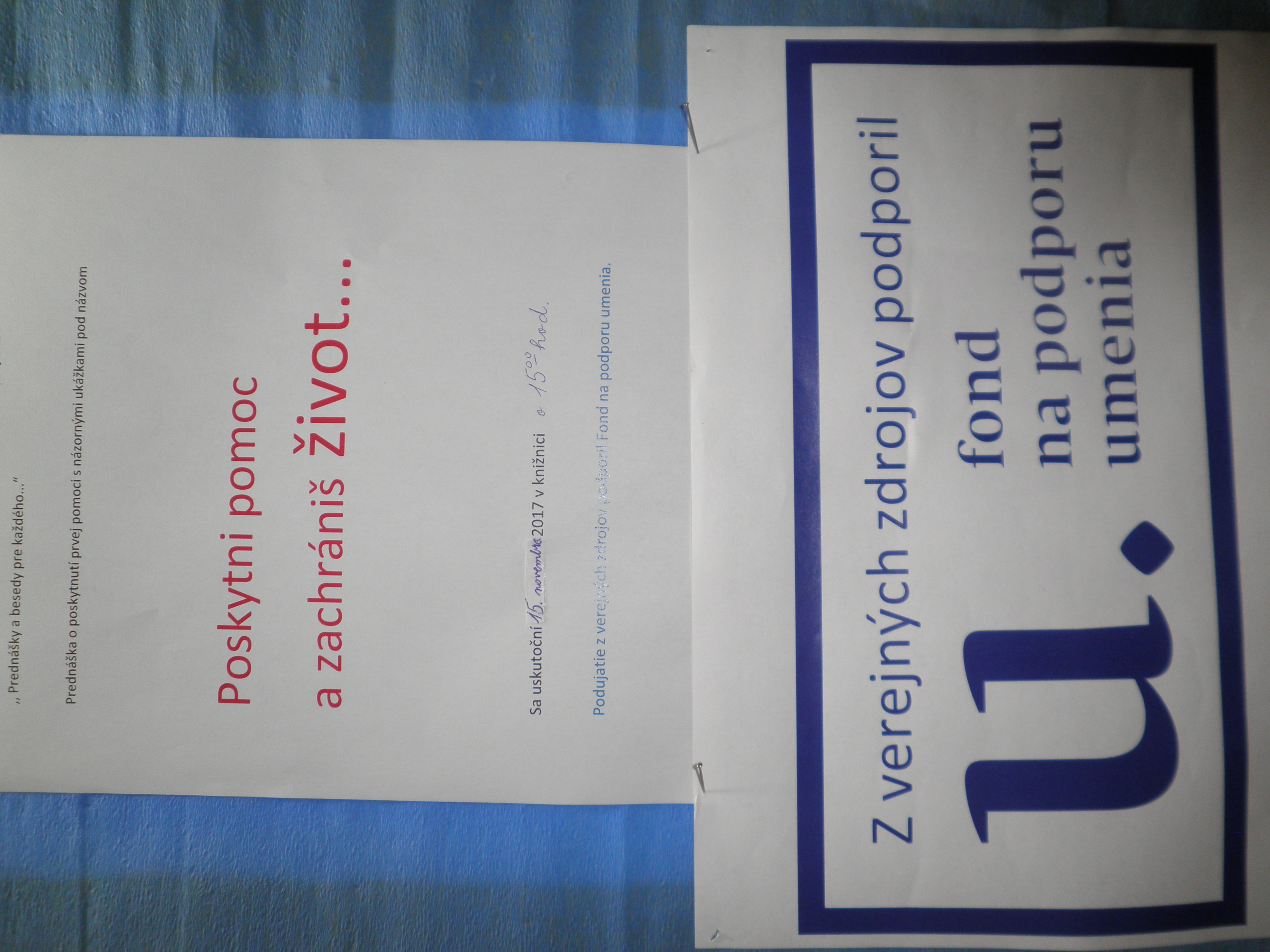 Fond na podporu umenia ako hlavný partner podujatia a obec Palárikovo- KNIŽNICA pozýva na podujatie z projektu,, Prednášky a besedy pre každého... Prednáška o poskytnutí prvej pomoci s názornými ukážkami pod názvom Poskytni pomoc a zachrániš život...sa uskutoční 15. novembra 2017 v knižnici Palárikovo so začiatkom o 15.00 hod. Podujatie z verejných zdrojov podporil Fond na podporu umenia.