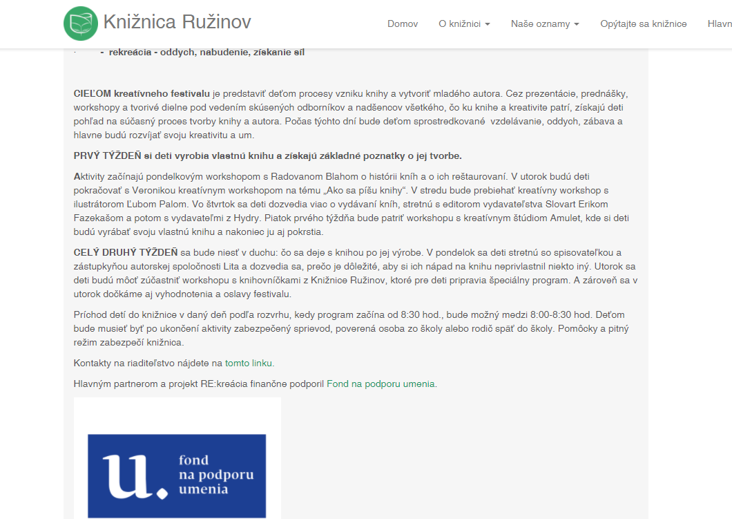 Informácie o podujatí, podporenom grantom z Fondu na podporu umenia, boli uverejnené primárne cez webovú stránku Knižnice Ružinov, vďaka čomu mohli aj rodičia detí, učitelia, kolegovia, či bežní návštevníci webovej stránky knižnice mať vedomosť o programe, pravidlách a priebehu festivalu a o tom, akou formou bol podporený. Vďaka tejto propagácii sa na festivale zúčastnili aj účastníci, ktorí sa o ňom dozvedeli priamo z príspevku na webovej stránke. Oznamy sa následne uverejňovali aj na Facebookovej stránke Knižnice Ružinov, čím sa o projekte dozvedel širší okruh ľudí, priaznivcov knižnice. Nakoľko nás na facebooku sledujú aj iné slovenské knižnice, mohli sme ich týmto spôsobom inšpirovať k vytvoreniu projektu a k spolupráci s FPU.