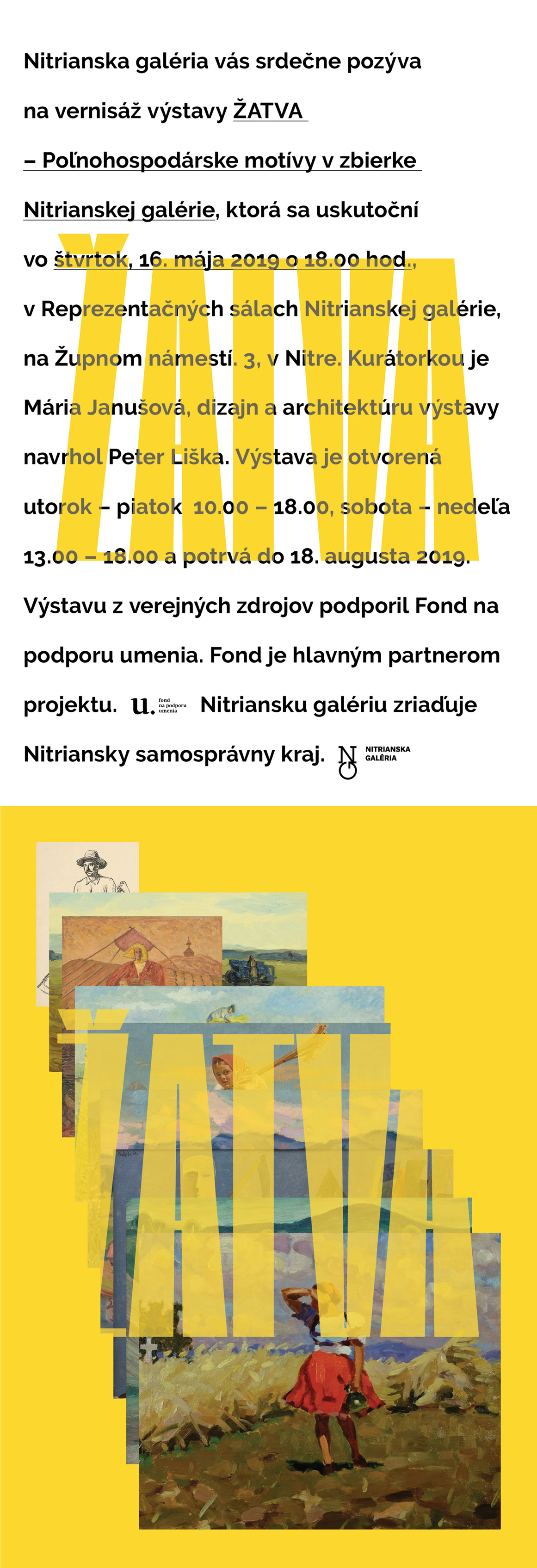 Výstava s názvom Žatva predstavuje diela s poľnohospodárskou tematikou, ktoré výhradne pochádzajú zo zbierky Nitrianskej galérie. Tieto diela tvoria výraznú časť galerijnej zbierky, do ktorej sa prioritne nadobúdali v rokoch 1965 – 1989, teda od vzniku inštitúcie po pád komunistického režimu. Totalitná moc z Nitry postupne vybudovala centrum slovenského poľnohospodárskeho života, čo sa odrážalo nielen v rozsiahlej rastlinnej a živočíšnej výrobe, ale taktiež aj vo vede a umení – zakladali sa stredné odborné školy a učilištia s agrárnym zameraním, Slovenská poľnohospodárska univerzita či výstavisko Agrokomplex. Orientácia regiónu na agropriemysel sa obyvateľom každodenne pripomínala aj vizuálnou formou, a to v rámci umeleckých realizácií vo verejnom priestore a v interiéroch inštitúcií, kde plastiky, reliéfy, mozaiky alebo nástenné maľby zobrazovali výjavy z poľnohospodárstva.