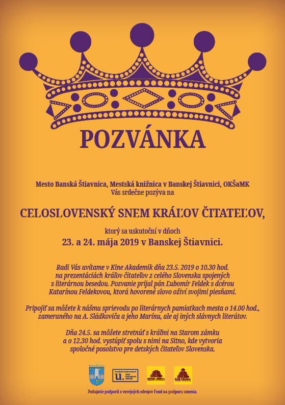 Mesto Banská Štiavnica bude hostiť počas dvoch dní čitateľských kráľov Slovenska z radov detí a mládeže základných škôl. Pozvanie prijal a podujatie podporí legenda slovenskej literatúry p. Ľubomír Feldek s Katarínou Feldekovou, ktorá spestrí literárnu besedu jeho zhudobnenými básňami. V rámci slávnostného prijatia kráľov hostia navštívia radnicu, kde budú prijatí p. primátorkou mesta Mgr. Nadeždou Babiakovou a následne sa zúčastnia kultúrneho programu, ktorý pripravila ZUŠ v Banskej Štiavnici. Besedovanie vystrieda predstavovanie jednotlivých kráľov čitateľov s prezentáciami jednotlivých miest a samotných kráľov čitateľov so všetkých kútov Slovenska, zastúpené sú všetky kraje Slovenska. Program pokračuje spoznávaním literárnych pamiatok Slovenska a zákutí Banskej Štiavnice, na druhý deň bude program pokračovať na Starom zámku, kde je pripravené ich sprevádzanie, pasovanie v Rytierskej sále, zápis do pamätnej knihy kráľov čitateľov a vytvorenie posolstva a výstup na vrch Sitno.