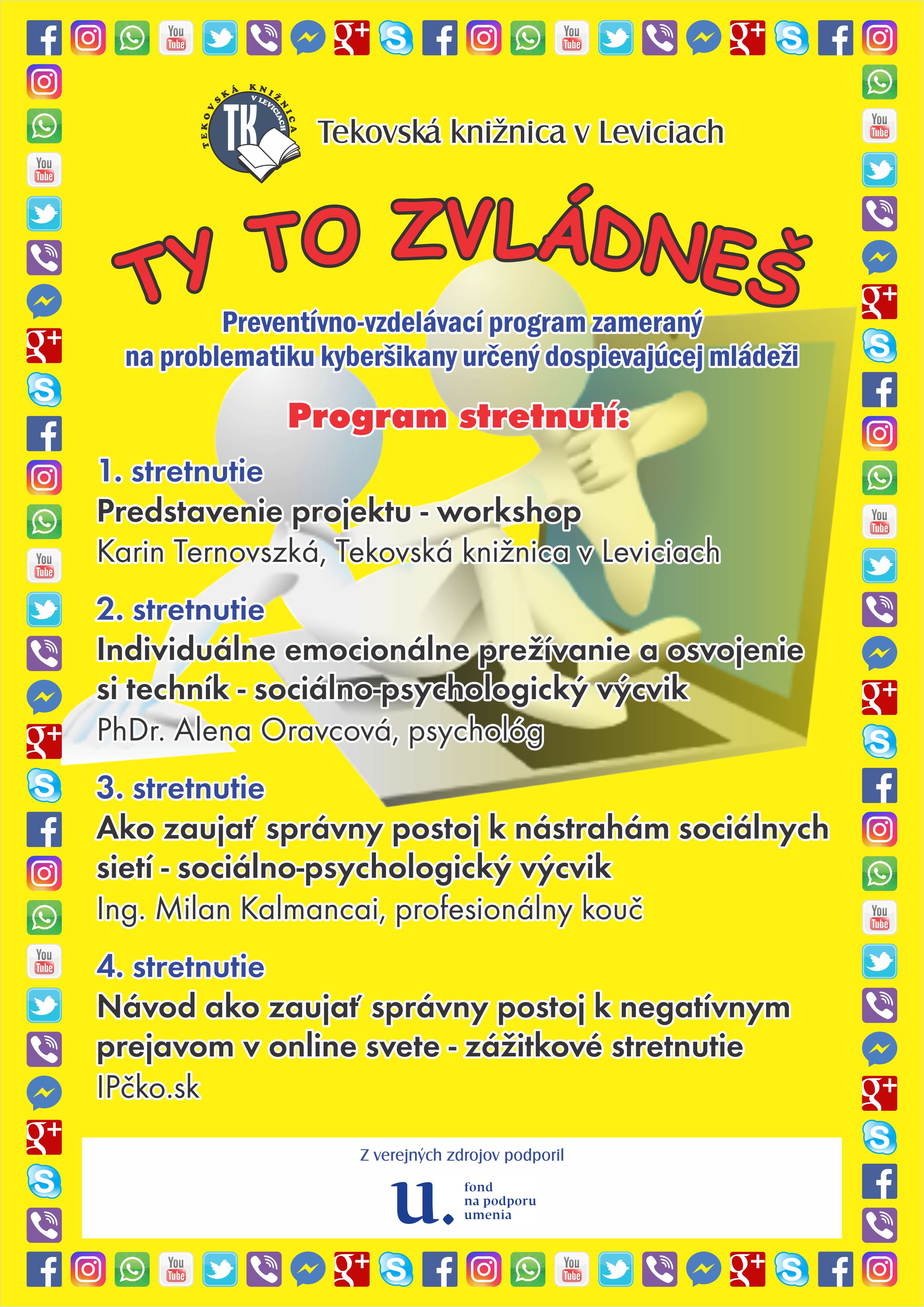 Tekovská knižnica v Leviciach v realizuje v zmysle projektu jeho prvú časť zameranú na prevenciu kyberšikany. Prebieha preventívno vzdelávací program pre stredoškolskú mládež "Ty to zvládneš". Účastníkmi sú žiaci Gymnázia Andreja Vrábla v Leviciach. K jednotlivým prednáškam a psychologickým výcvikom programu boli pripravené propagačné plagáty, záložky a informačné letáky.