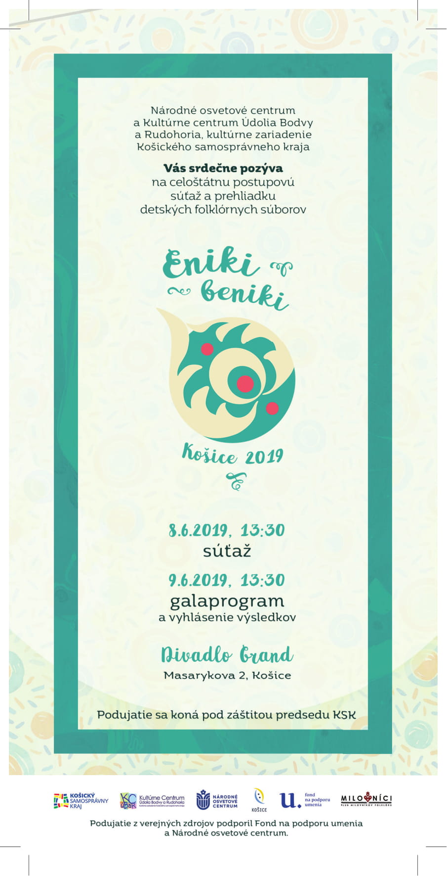 detských folklórnych súborov na 27. ročník celoštátnej súťaže s názvom ENIKI BENIKI 2019, ktorá sa bude konať 8. a 9. júna 2019 v košickom Divadle GRAND. Podujatie sa koná pod