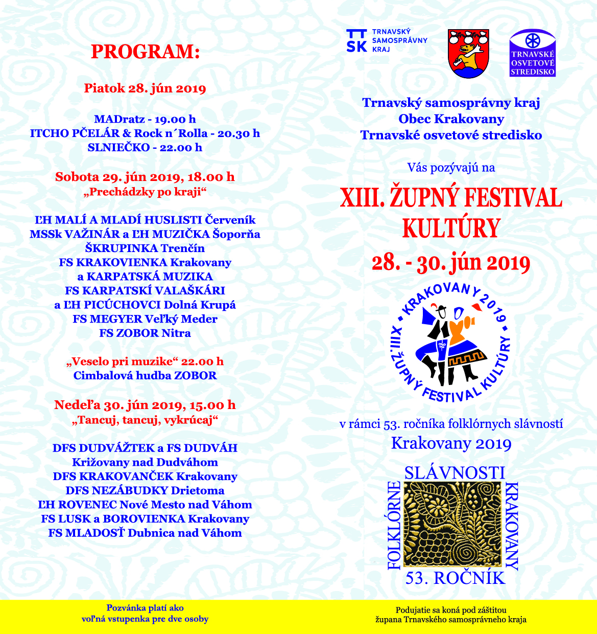 zároveň aj 13. ročník Župného festivalu kultúry Krakovany 2019. Prostredníctvom týchto folklórnych slávností dávame