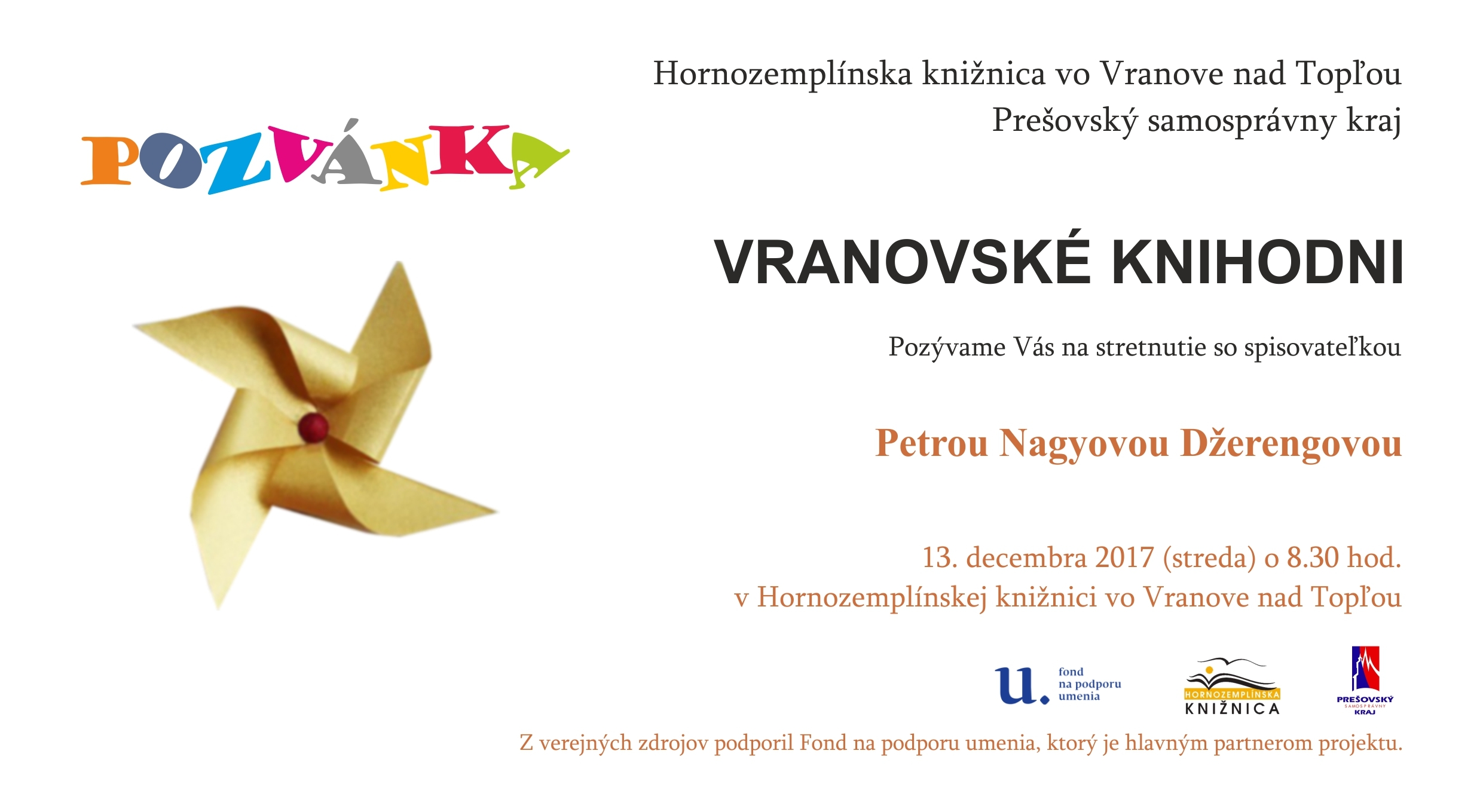 Dňa 12. a 13. decembra 2017 sa v Hornozemplínskej knižnici vo Vranove nad Topľou uskutoční stretnutie so slovenskou spisovateľkou Petrou Nagyovou Džšrengovou,ktorá, predstaví širokej verejnosti vranovského regiónu a deťom ZŠ svoju tvorbu.
