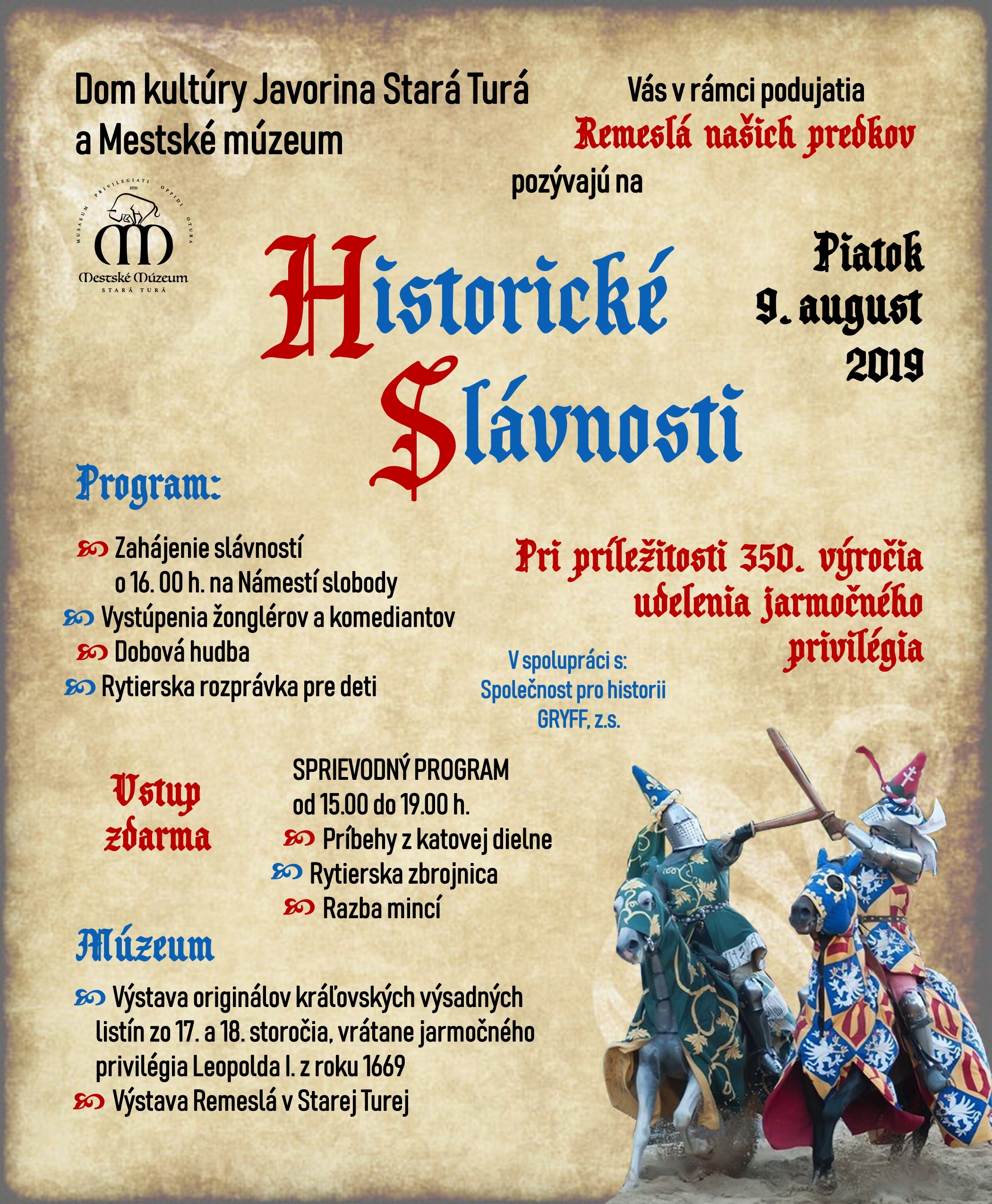 Remeslá našich predkov už po trinásty krát opäť v Starej Turej. Remeselný trh, ľudová hudba, tradičné jedlá, remeselníci, dobrá atmosféra a skvelá nálada na Vás budú čakať 9.8.2019 na Námestí slobody a v Dome kultúry Javorina. Rok 2019 so sebou nesie i 350. výročie od udelenia jarmočného privilégia Starej Turej. Pri tejto príležitosti bude pre návštevníkov pripravený historický sprievod, dobová hudba, historky s katovej dielne, rytiersky stan, dielňa na mince a mnoho iného. V Mestskom múzeu bude pre návštevníkov pripravená výstava Remeslá v Starej Turej. Návštevníkom priblíži rôzne remeselné činnosti, ktorým sa venovali naši predkovia v minulosti, najmä však tie, ktoré boli typické pre naše mestečko. V rámci podujatia bude tiež prebiehať výstava fotografií s názvom Zvyky a obyčaje Starej Turej, prostredníctvom ktorej chceme návštevníkom priblížiť a pripomenúť tradície nášho regiónu.