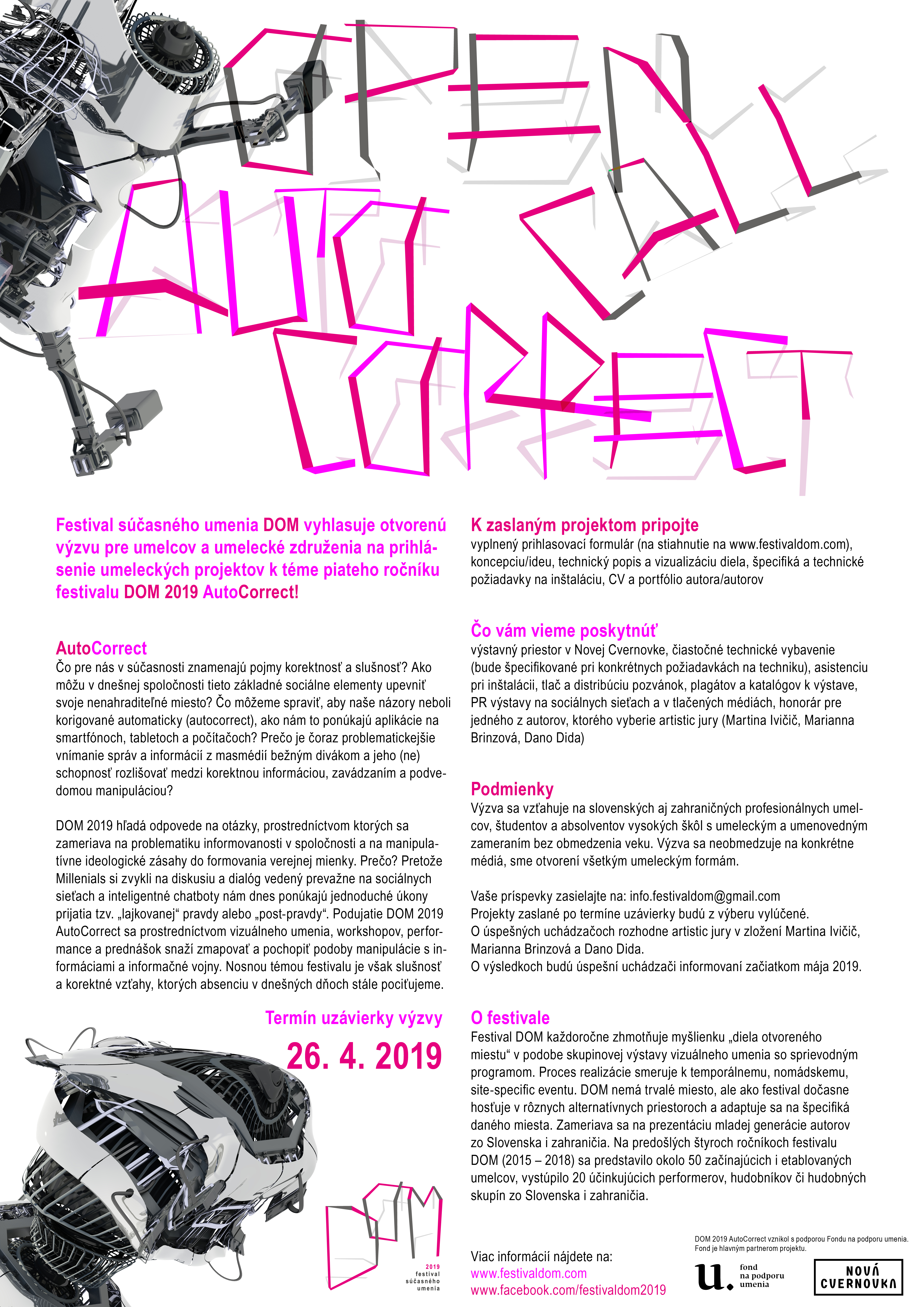 Projekt DOM 2019 s podnázvom AUTOCORRECT sa prostredníctvom umeleckého vyjadrenia zameral na podoby manipulácie s informáciami, množenie „nových právd“ a bujnenie informačných vojen prostredníctvom hoaxov, konšpirácií a tzv. postprávd (z ang. post truth). DOM 2019, v otvorenej výzve pre umelcov a umelecké združenia, dal možnosť reagovať na súčasné politicko-spoločenské dianie na Slovensku, zrkadliace prehnaný nacionalizmus a deformáciu rôznych morálnych a sociálnych aspektov spoločnosti. Téma 5. ročníka festivalu DOM s podnázvom AUTOCORRECT sa venuje nutnosti prehodnotenia a sebareflexie jedinca voči spoločnosti, kedy jedinou možnosťou (ako vytvárať zdravú spoločnosť) je začať od elementárnych podnetov, akými sú slušnosť a korektnosť. Čo pre nás v súčasnosti slová ako slušnosť a korektnosť vôbec znamenajú? Ako môžu tieto základné sociálne elementy v dnešnej spoločnosti upevniť svoje nenahraditeľné miesto? Čo môžeme spraviť, aby naše názory neboli korigované automaticky (autocorrect) ako nám to ponúkajú aplikácie na smartfónoch, tabletoch a počítačoch? Dôležitým aspektom podujatia DOM 2019 AUTOCORRECT je snaha vkladať túto pozornosť a vedomosť aj do výchovy detí prostredníctvom umenia. Festival DOM 2019 prostredníctvom vizuálneho umenia, workshopov, public performance a prednášok podnietil verejnosť k potrebe vlastného názoru, nezávislého od masmediálnych hoaxov a demagogických vplyvov.