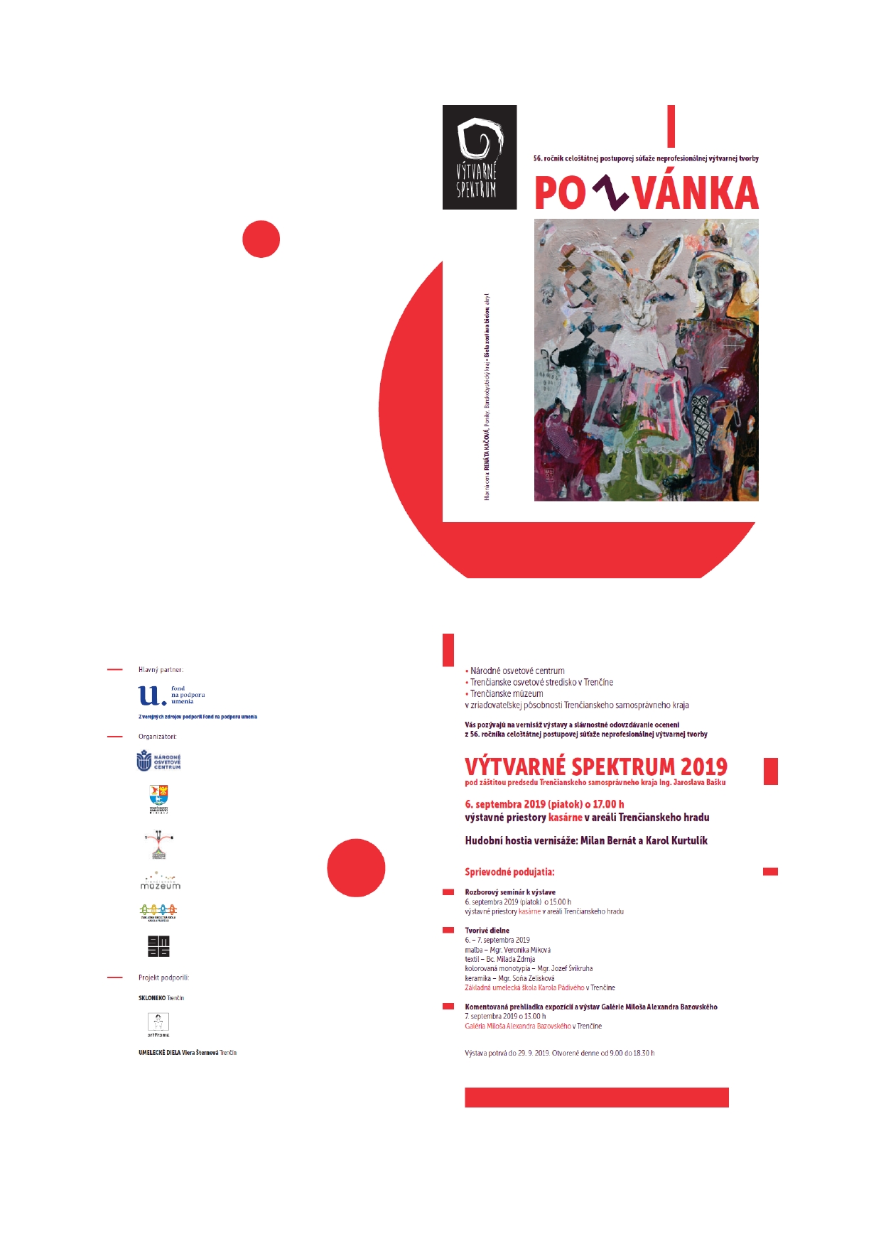 Srdečne vás pozývame na výstavu z 56. ročníka celoštátnej postupovej súťaže neprofesionálnej výtvarnej tvorby Výtvarné spektrum 2019 do výstavných priestorov kasárne v areáli Trenčianskeho hradu.