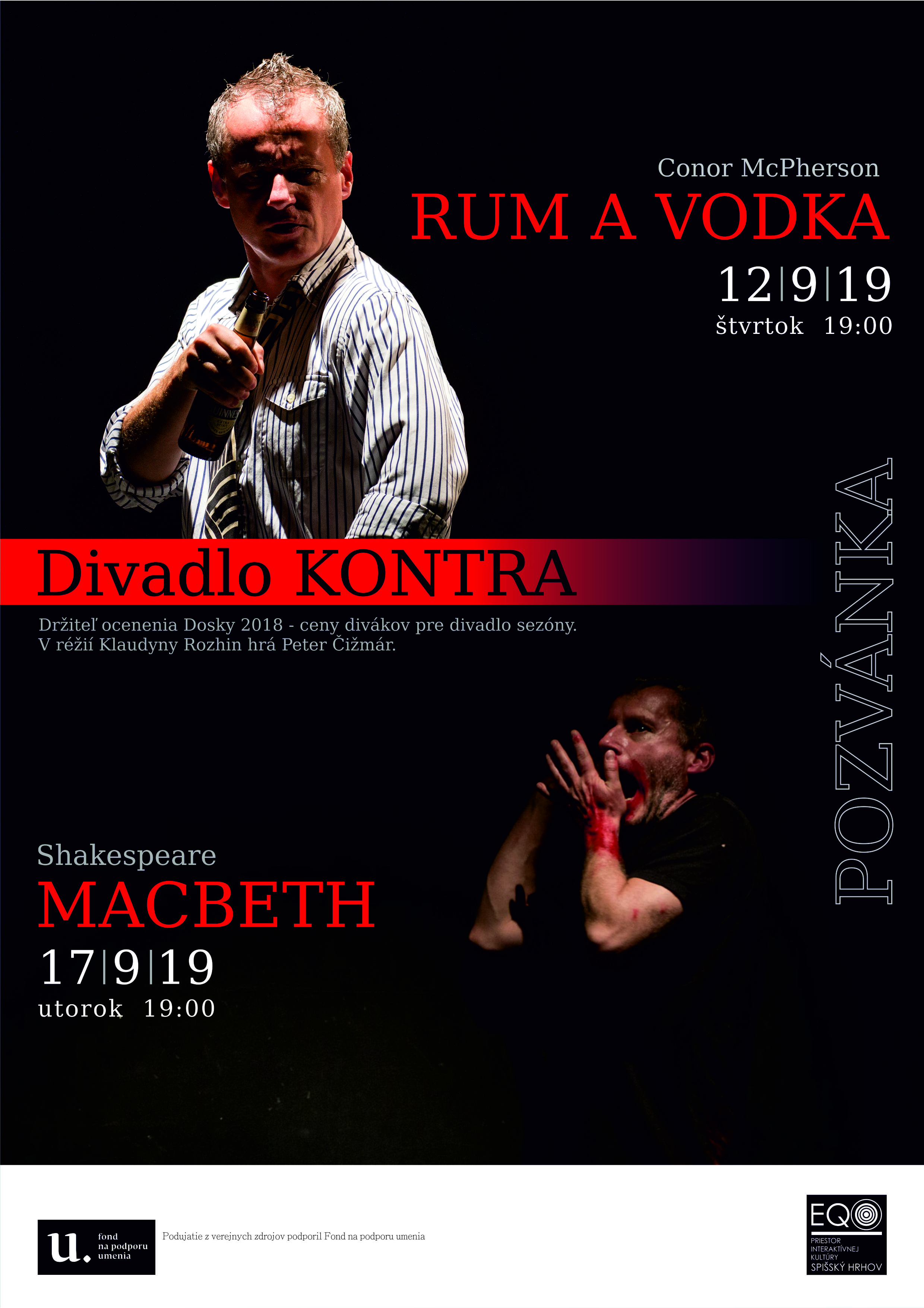 Pozývame na predstavenie držiteľa ocenenia Dosky 2018 - ceny divákov pre divadlo sezóny v utorok 17. septembra 2019 o 19.hod v EQO (priestor interaktívnej kultúry), Komenského 2, Spišský Hrhov.