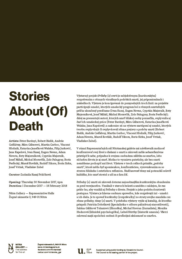 Výstavný projekt Príbehy (o) smrti je mojím subjektívnym (kurátorským) rozprávaním o rôznych vizuálných podobách smrti, jej pripomienok i následkov. Výstava je koncipovaná do pomyselných troch línií: na projekte praticipujú umelci, ktorých umelecký program bol z rôznych smrteľných príčin ukončený predčasne (Eugen Nevan, Cyprián Majerník, Zolo Palugyay, Bety Majerníková, Michal Moravčík, Jozef Mihál, Boris Perfecký, Ivan Kasaj); ďalej sa prezentújú autori, ktorých smrť blízkej osoby poznačila, ovplyvnila aj časť ich umeleckej práce (Mira Gaberová, Peter Barényi, Jana Kapelová, Katarína Janečková-Walshe); a na koniec sú na výstave zastupení aj umelci, ktorých smrť aj jej rôzne podoby fascinujú a ovplyvňuje ich výtvarný prejav (Vincent Hložník, Rudolf Sikora, András Cséfalvay, Martin Gerboc, Filip Jurković, Róbert Bielik, Adam Novota, Boris Sirka, Maroš Rovňák, Jozef Vrtiak, Vladislav Zabel).