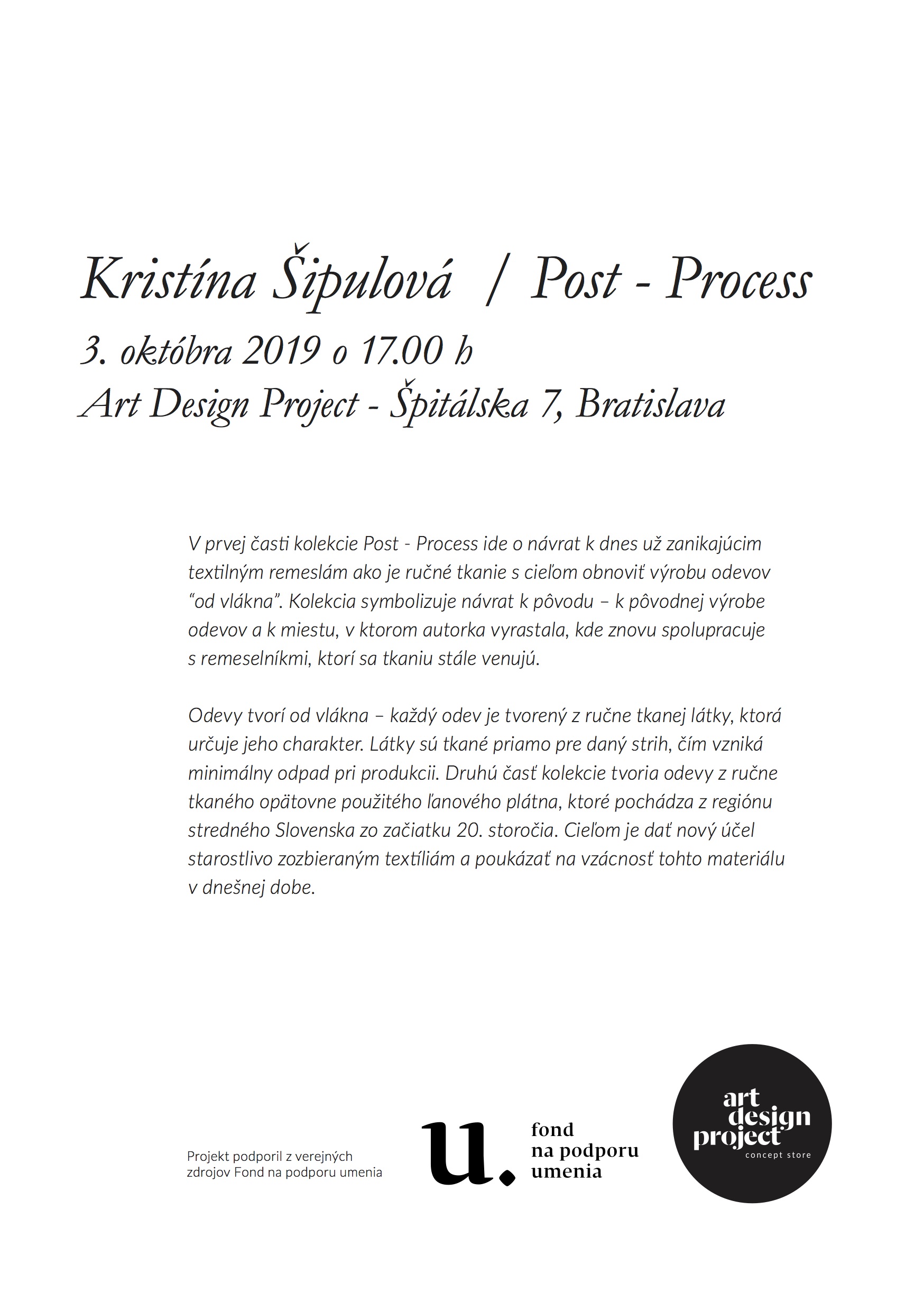 Prezentácia kolekcie Post - Process v ktorej ide o návrat k dnes už zanikajúcim textilným remeslám ako je ručné tkanie s cieľom obnoviť výrobu odevov “od vlákna”. Kolekcia symbolizuje návrat k pôvodu – k pôvodnej výrobe odevov a k miestu, v ktorom autorka vyrastala, kde znovu spolupracuje s remeselníkmi, ktorí sa tkaniu stále venujú.