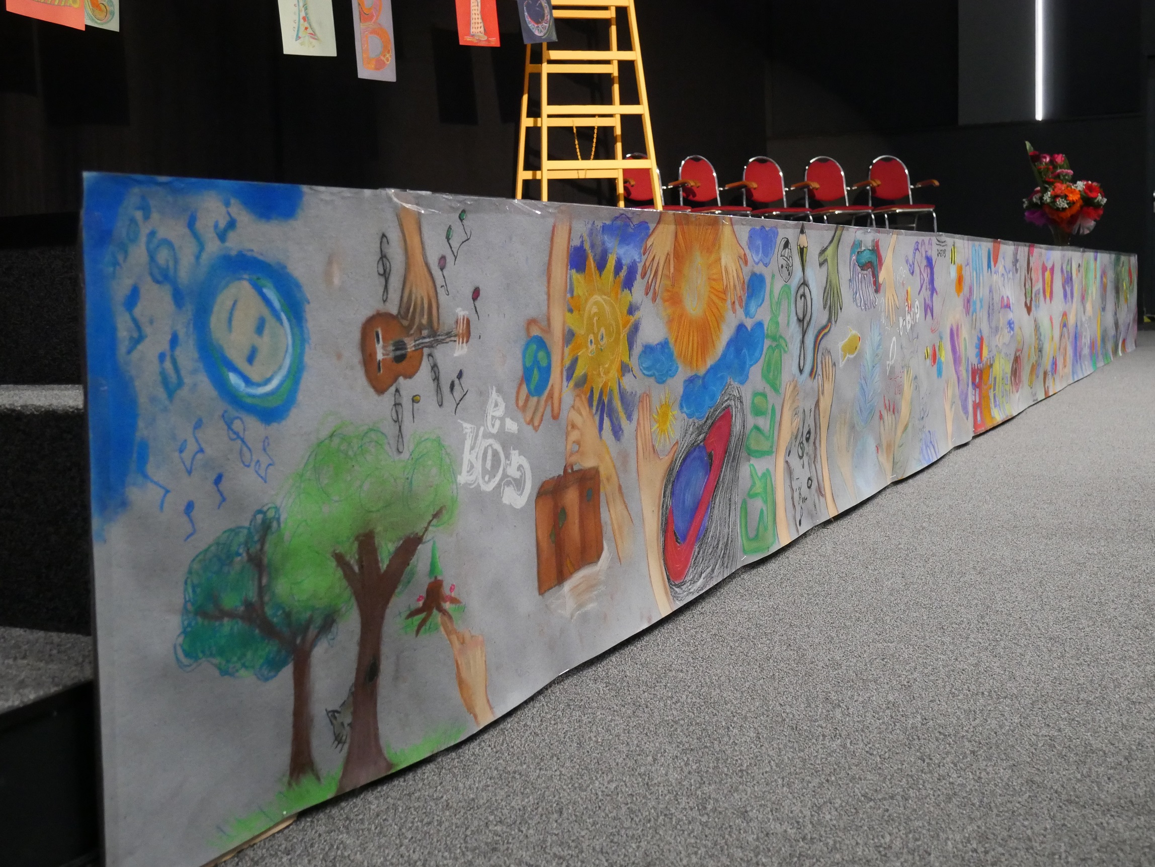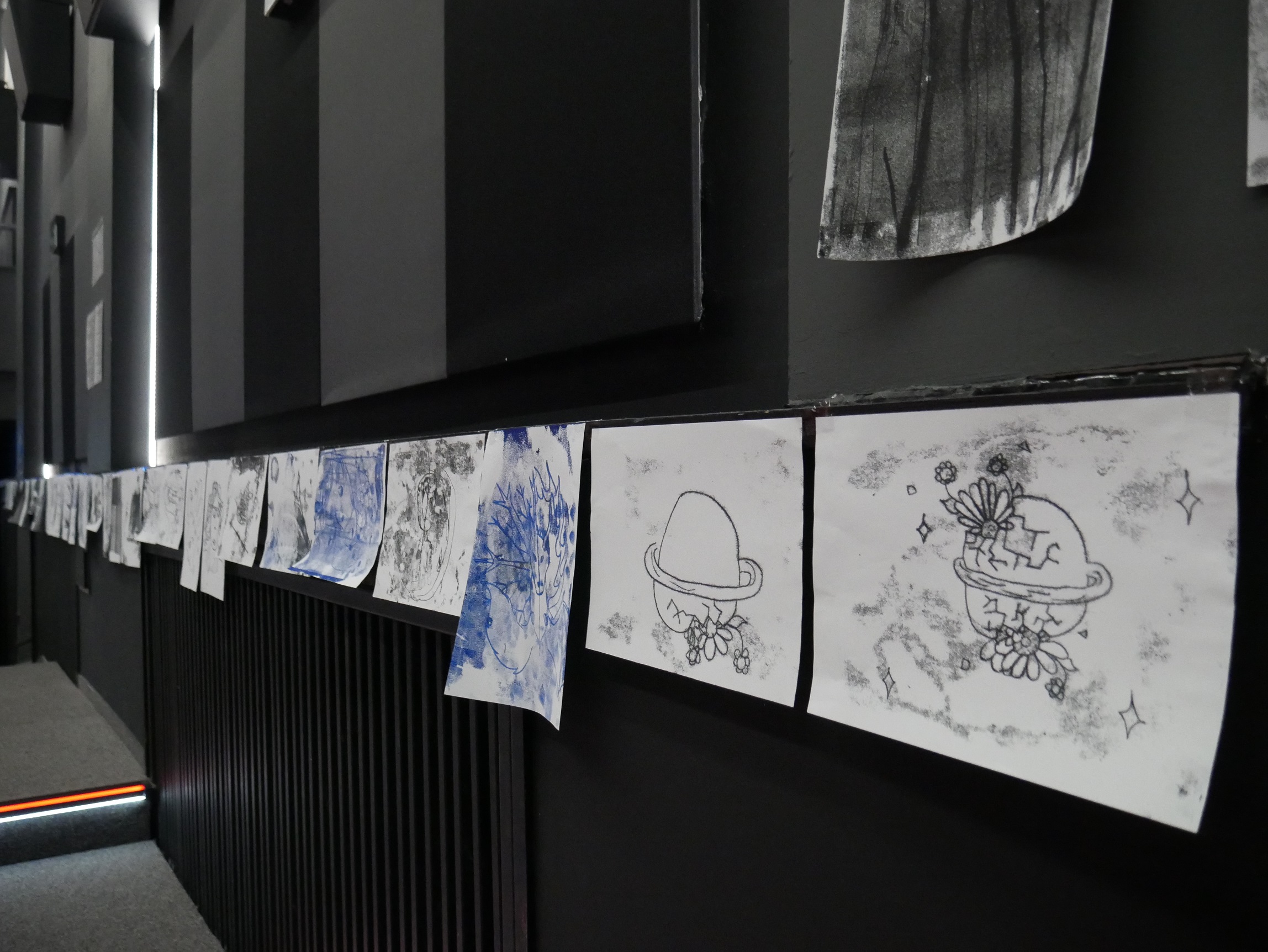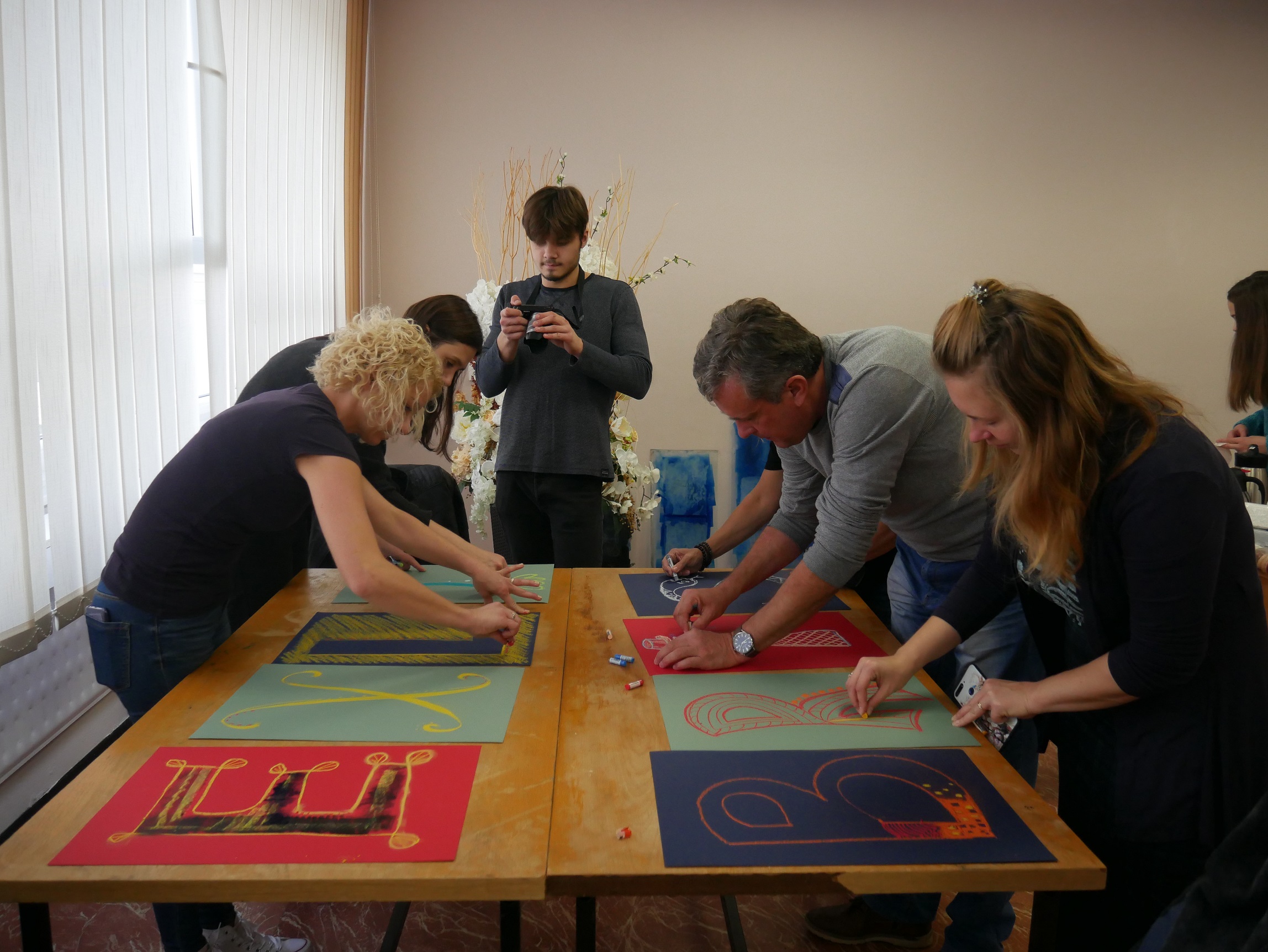 deti monotypy, na ktorých stvárnili svoje osobné „logá“. „Logá“ potom prekreslili na dlhý pás papiera. Učitelia zatiaľ maľovali nápis EX LIBRIS,