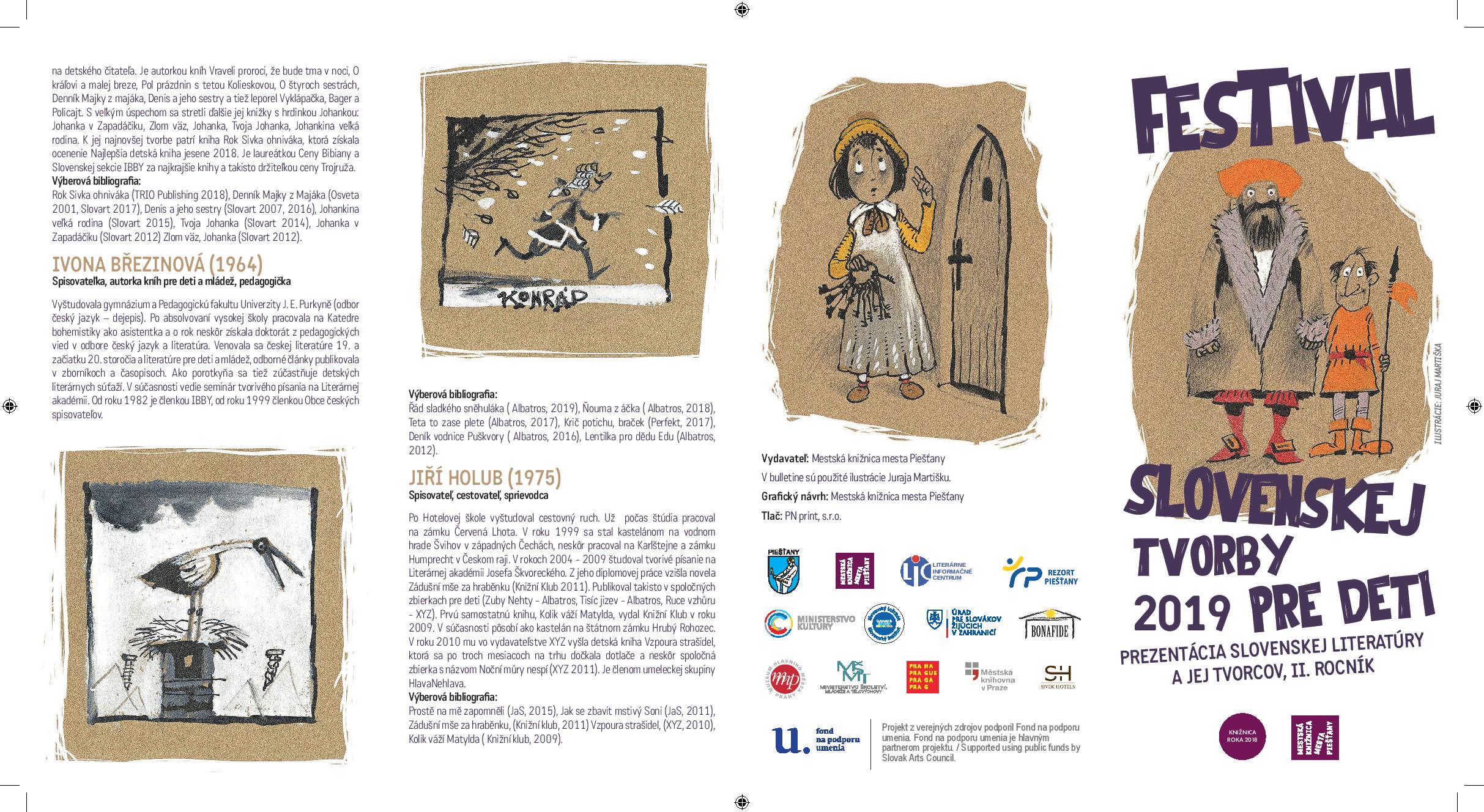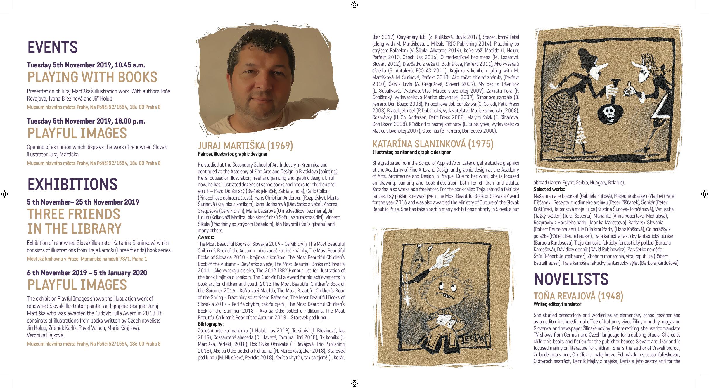 Informačný leták obsahuje informácie o účinkujúcich autoroch - spisovateľoch a ilustrátoroch, informácie o podujatiach prebiehajúcich v Múzeu hlavního města Prahy a Městskej knihovně v Prahe v rámci Festivalu slovenskej tvorby v Prahe v novembri. Účinkujúci autori: ilustrátori Juraj Martiška a Katarína Slaninková; spisovatelia Toňa Revajová, Ivona Březinová, Jiří Holub; moderátori Richard Trsťan a Barbora Krajč Zamišková.