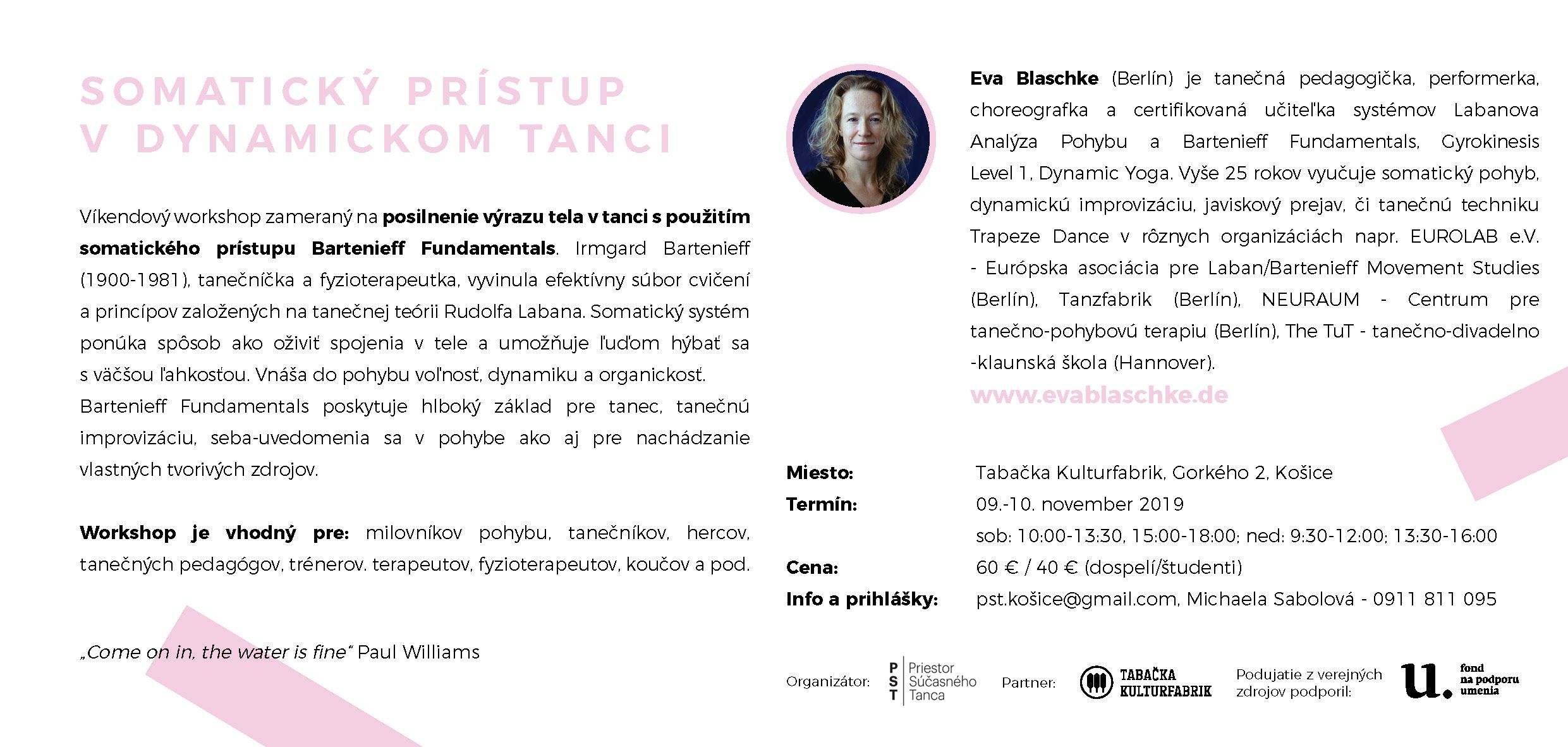 Intenzívny víkendový workshop lektorky Evy Blaschke (Berlin, Nemecko). Zameraný na posilnenie výrazu tela v tanci s použitím somatického prístupu Bartenieff Fundamentals.