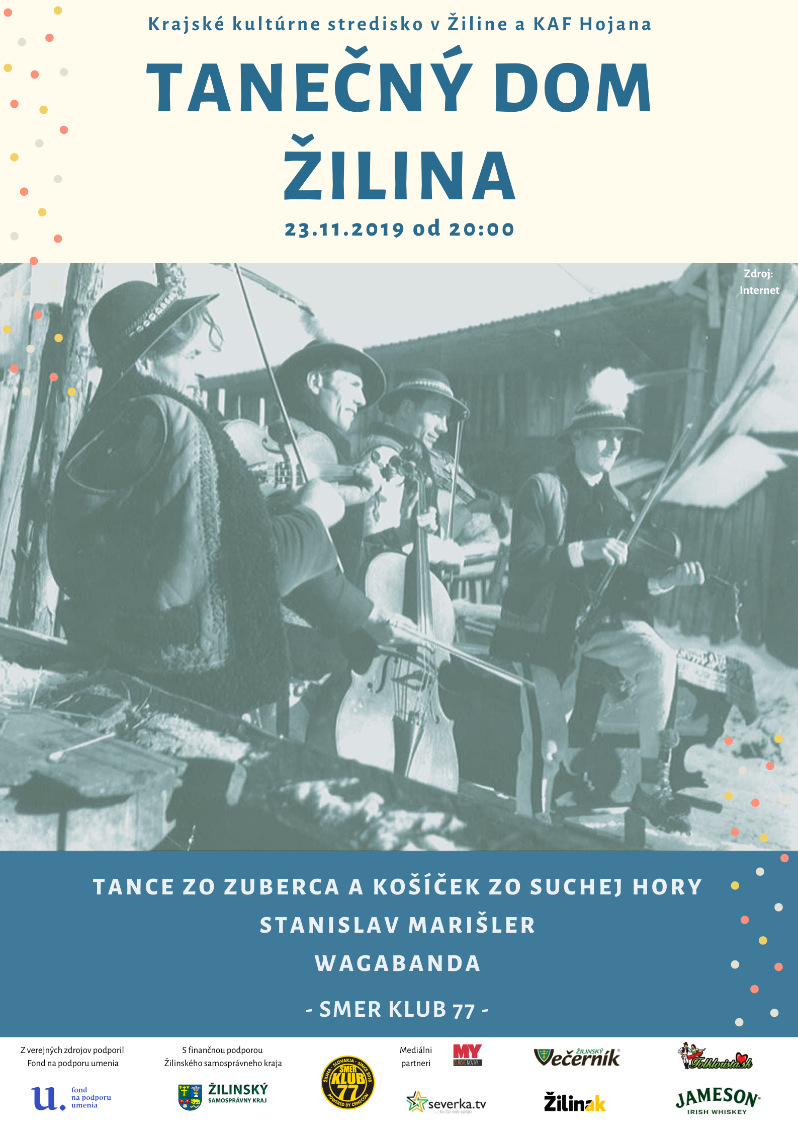 výučby ľudového tanca II., ktorý sa uskutoční 23. novembra 2019 od 15:00 v priestoroch Smer klub 77 – music bar (R. Zaymusa 72/8, 01001 Žilina). Súčasťou vzdelávacieho workshopu je