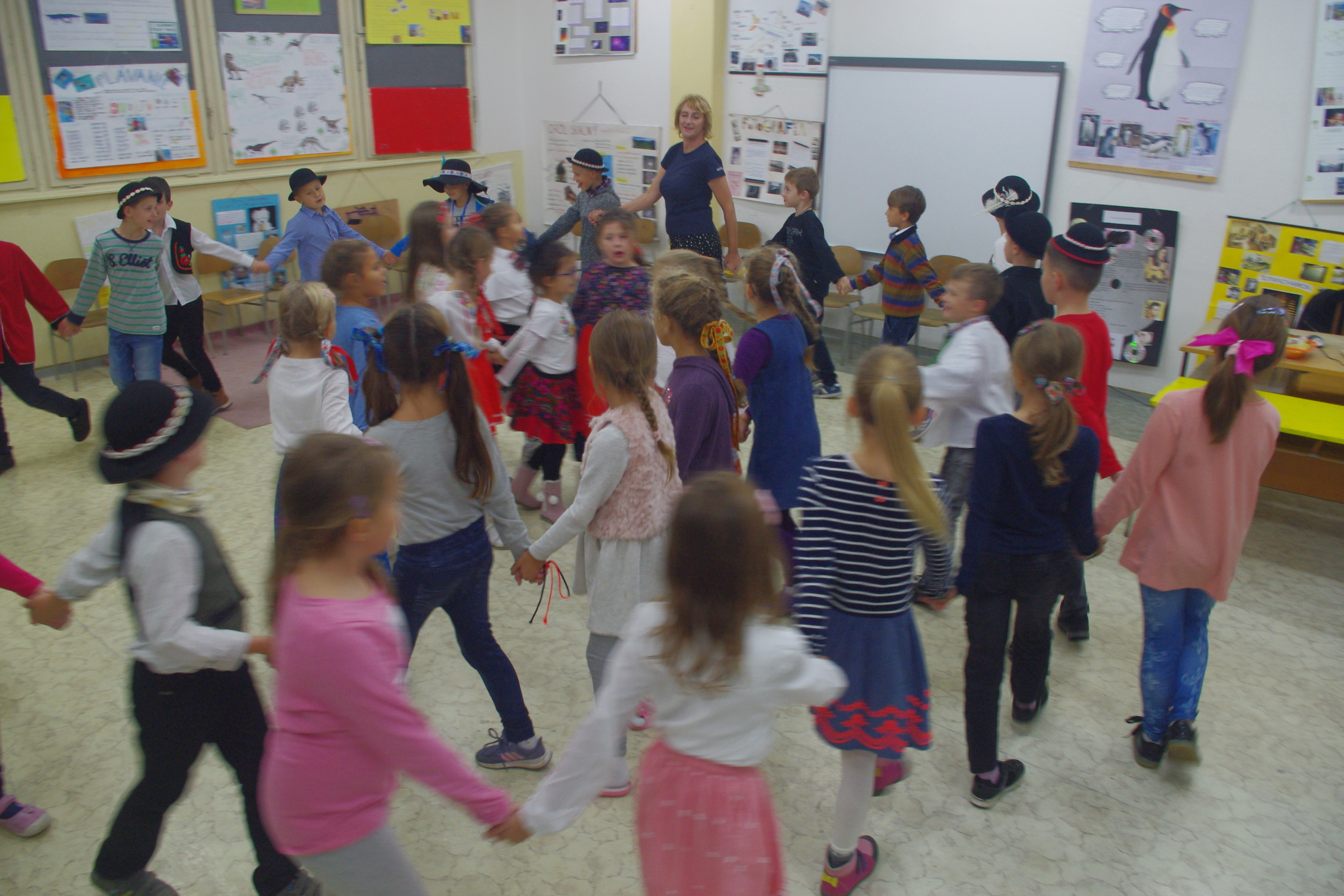 Folkloristka Jarka Lajgútová upútala detičky rozprávaním o jesenných a zimných zvykoch a tradíciách v Gemeri-Malohonte a Stanka Zvarová si s detičkami od srdca zatancovala a zaspievala.