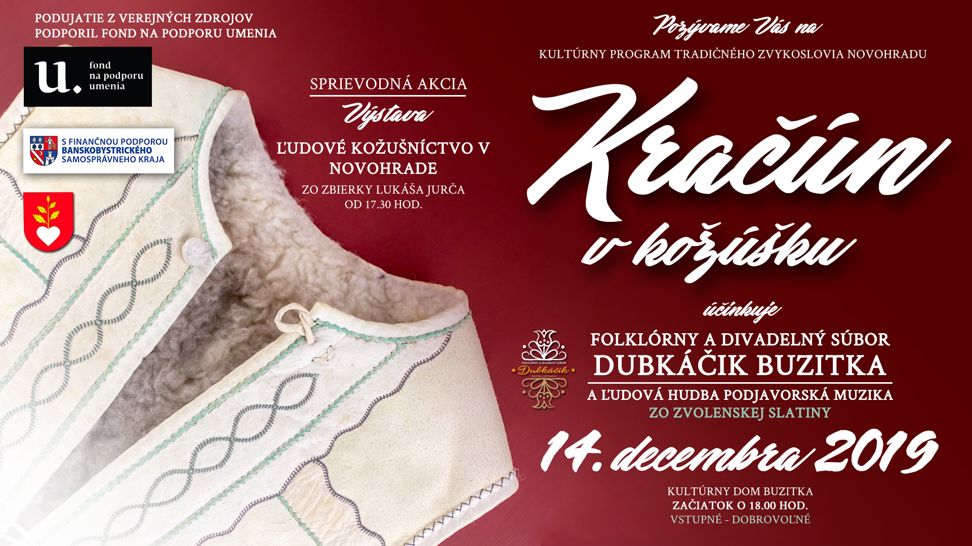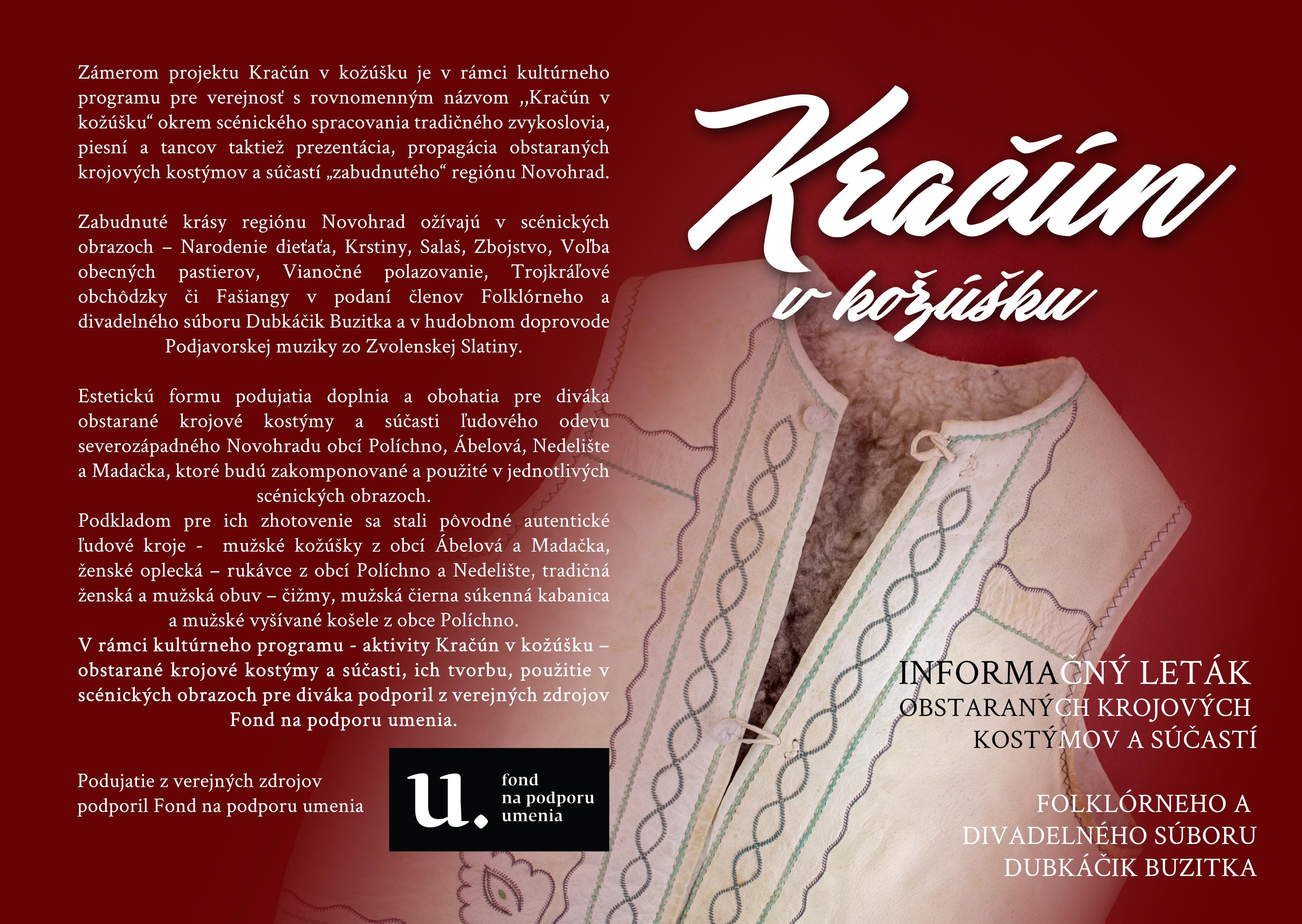 V rámci kultúrneho programu - aktivity Kračún v kožúšku – obstarané krojové kostýmy a súčasti, ich tvorbu, použitie v scénických obrazoch pre diváka podporil z verejných zdrojov Fond na podporu umenia.
