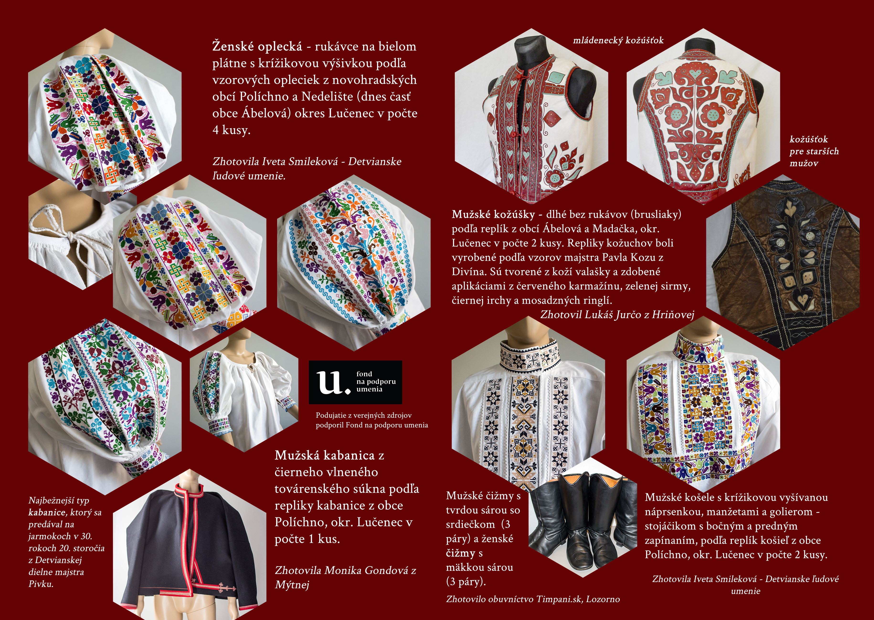 Podkladom pre ich zhotovenie sa stali pôvodné autentické ľudové kroje - mužské kožúšky z obcí Ábelová a Madačka, ženské oplecká – rukávce z obcí Políchno a Nedelište, tradičná ženská a mužská obuv – čižmy, mužská čierna súkenná kabanica a mužské vyšívané košele z obce Políchno.