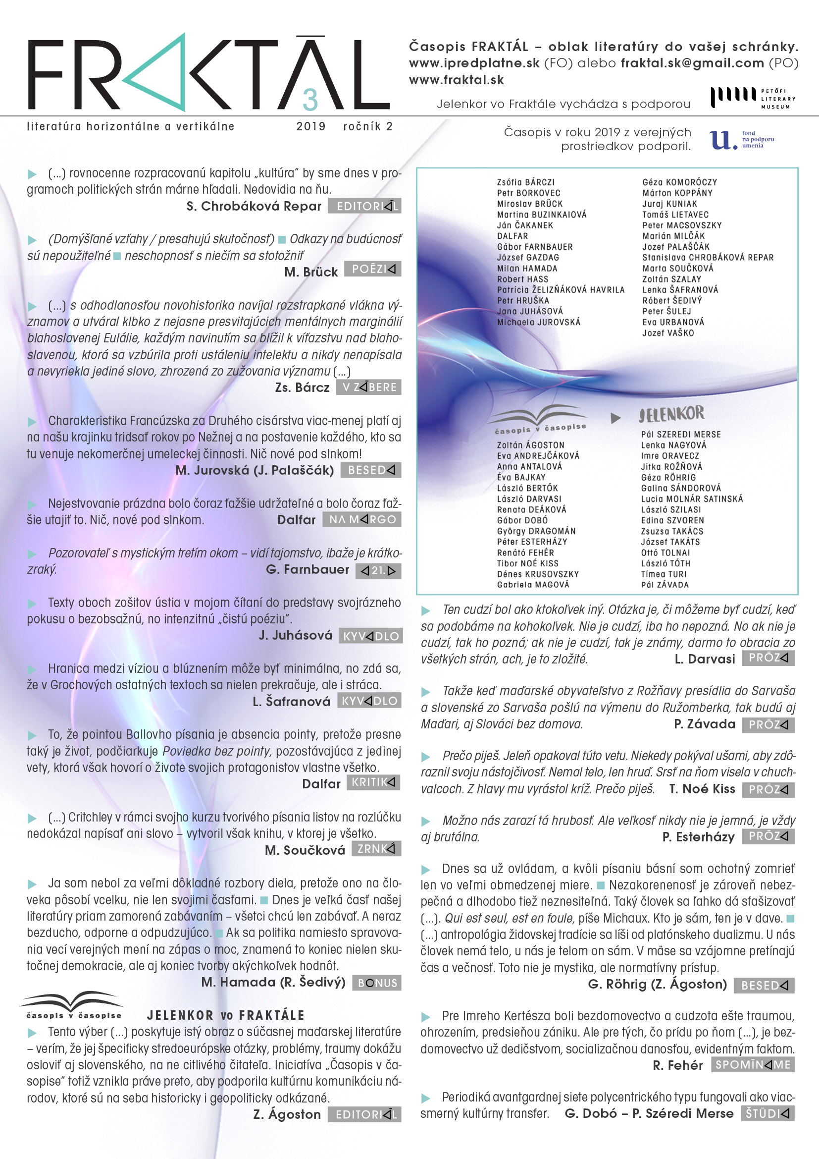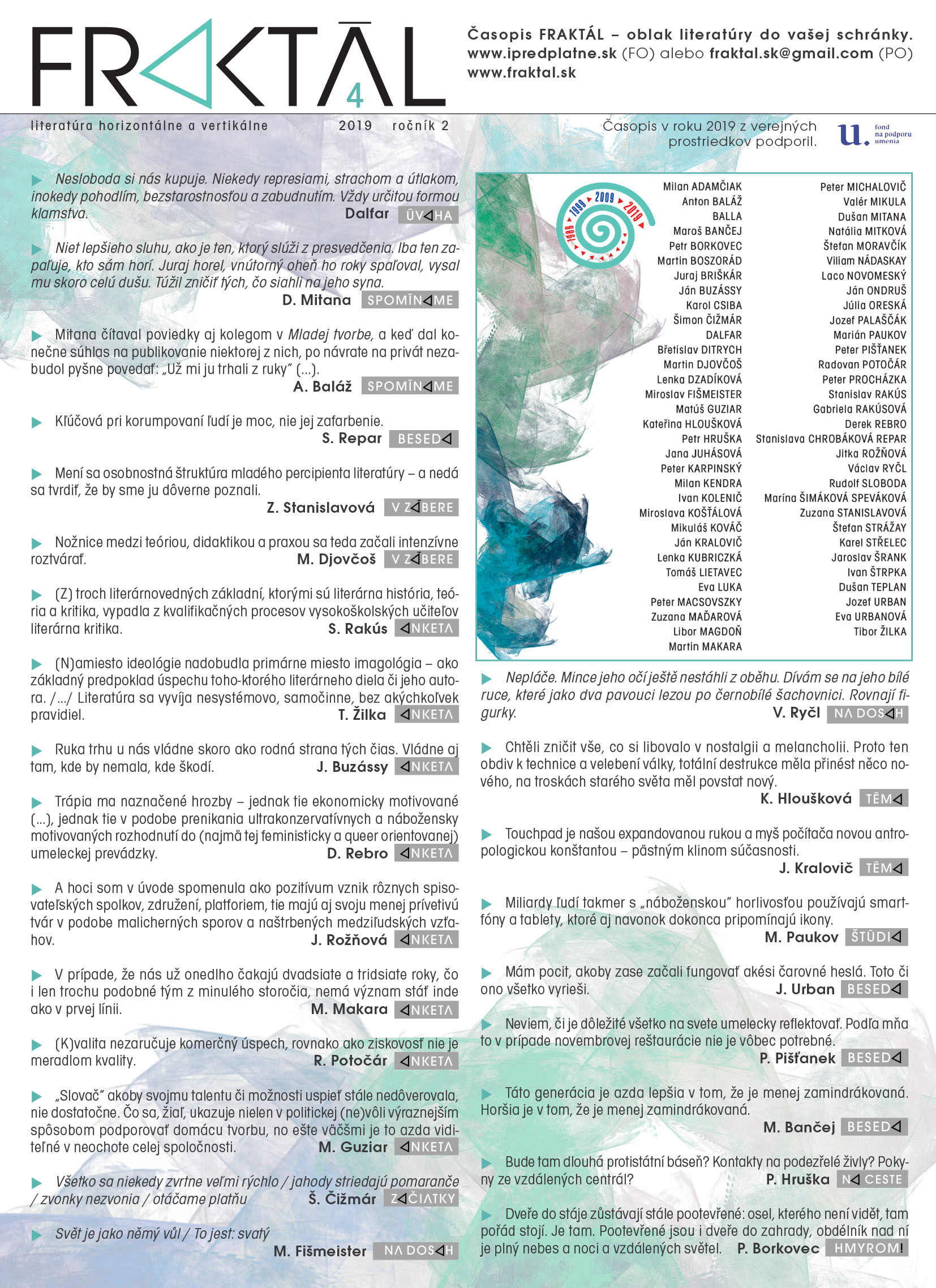 naša i vaša snaha priniesla svoje ovocie: nezávislý časopis Fraktál je dnes považovaný za relevantný faktor na slovenskej literárnej scéne. Ukončili sme 2. ročník, v ktorom sme obsahom aj kvalitou presvedčili aj tých najnáročnejších. Vstupujeme do 3. ročníka, v ktorom budeme pokračovať v tom najlepšom a prinesieme aj inovácie, ktoré ulahodia najmä oku. V 2. ročníku ste vyslovili množstvo múdrych i provokatívnych názorov, vytvorili veľa veršov a viet, ktoré zažiarili svojou hĺbkou i spracovaním. Krátky výber z nich prinášajú naše upútavky, de facto najstručnejšia možná MINI-ANTOLÓGIA celého ročníka. Tu sú - s pripomenutím niektorých autorov, ktorí s nami v roku 2019 spolupracovali, ale i našich rubrík, ktoré na vás čakajú aj v roku 2020. Ďakujeme za všetky vyslovené a napísané prejavy podpory i ocenenia počas celého roka 2019. Zachovajte nám svoju priazeň aj v 3. ročníku existencie časopisu; my vás nesklameme. :-)