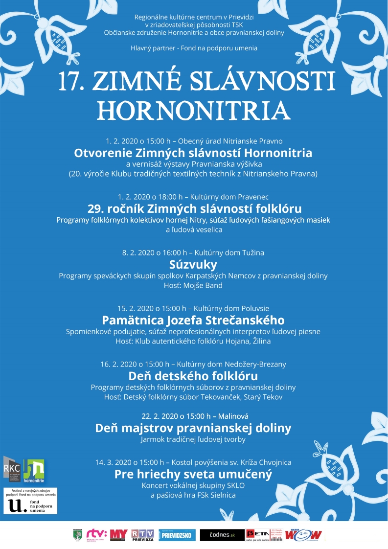 Otvorenie Zimných slávností Hornonitria je spojené s vernisážou výstavy "Pravnianska výšivka", ktorá sa realizuje pri príležitosti 20. výročia Klubu tradičných textilných techník z Nitrianskeho Pravna, ktorý pracuje pod vedením Anny Husárovej a majstra ľudovej umeleckej výroby Rastislava Haroníka.
