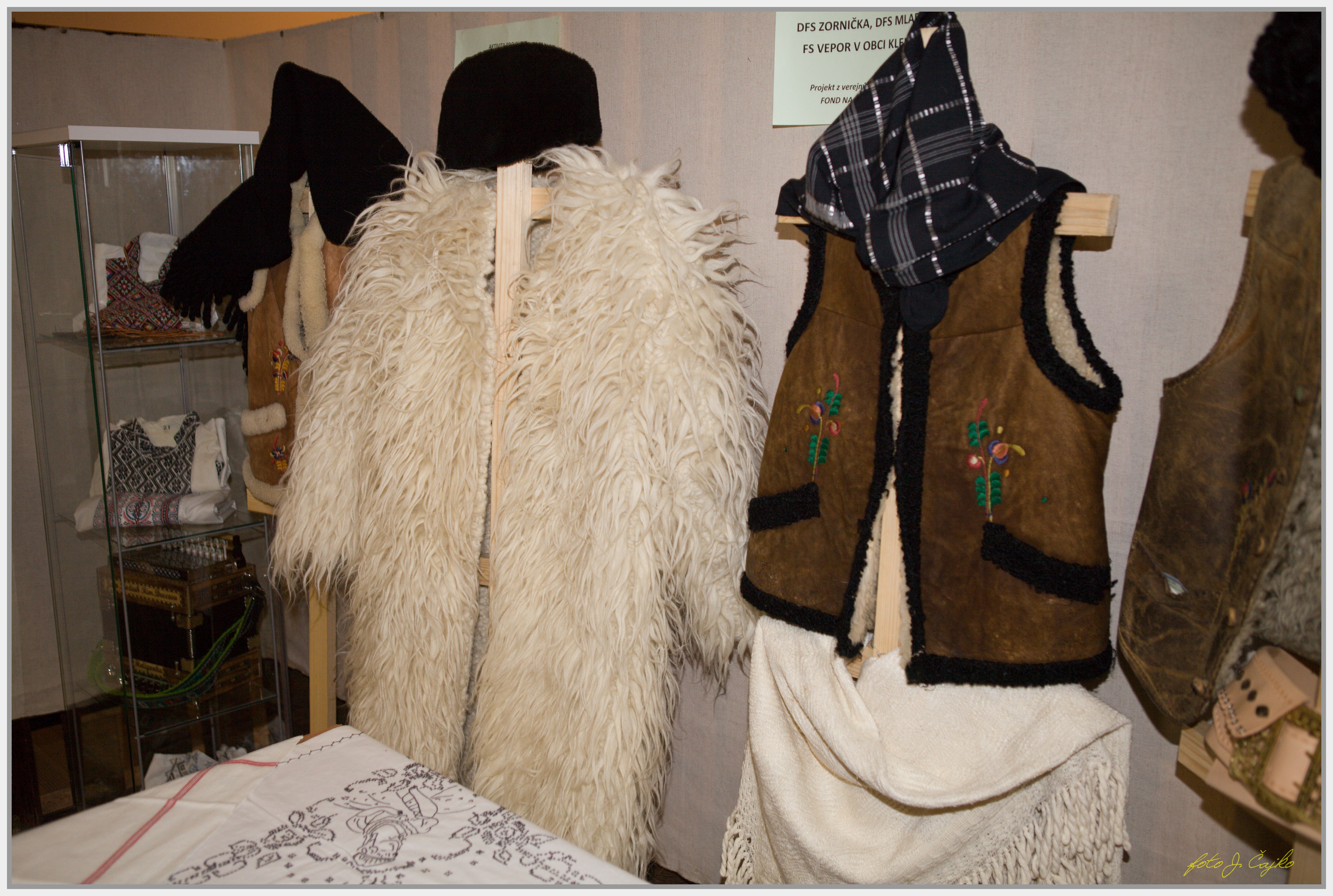 Výstava zozbieraných artefaktov ľudového odevu z obce Klenovec a časti zakúpených súčastí krojov ako aj hudobných nástrojov - heligónka, ozembuch.