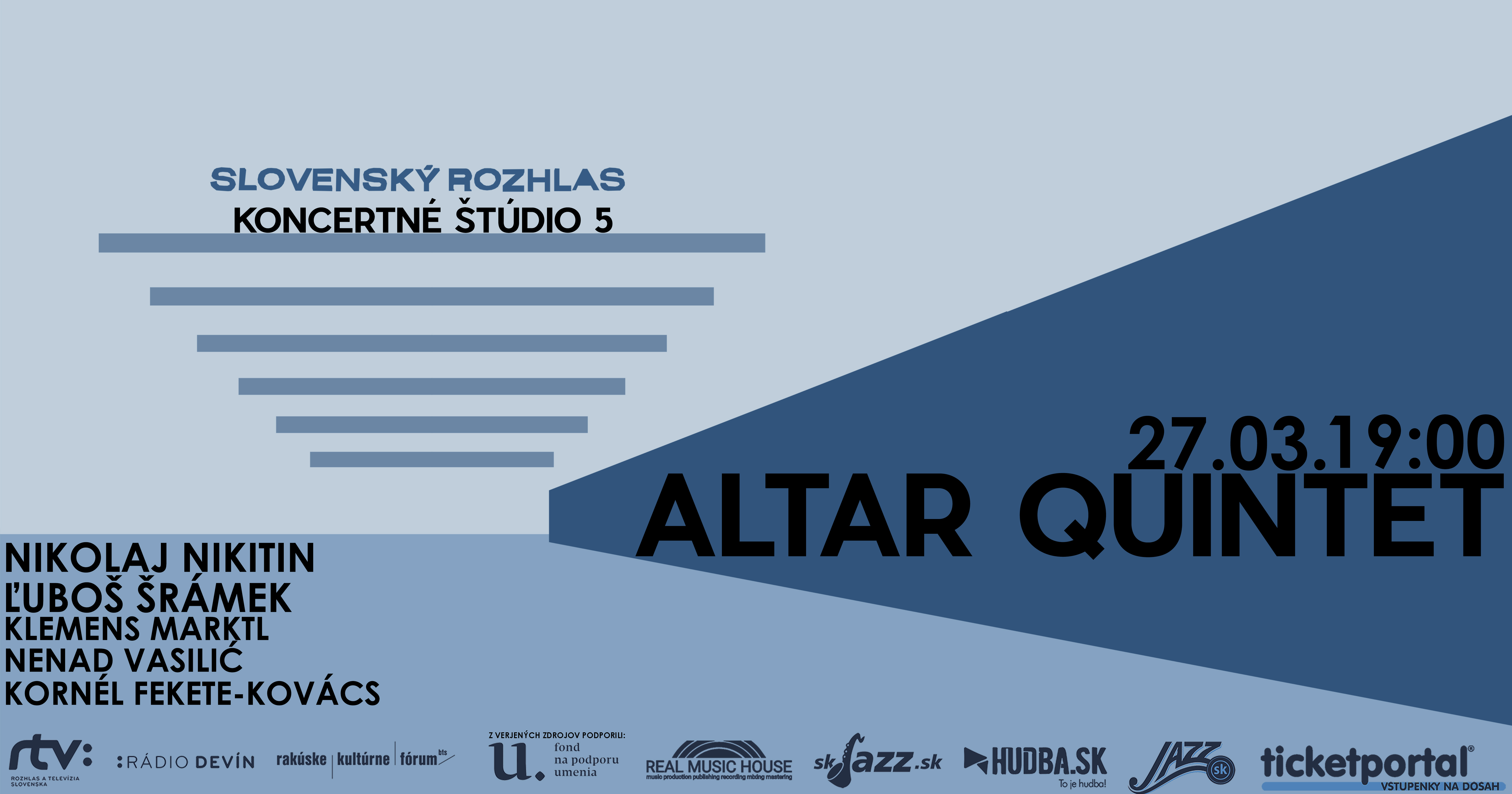Koncert v malom koncertnom štúiu č.5 v RTVS, Mýtna ulica 1. Altar Quintet v obsadzeni: Nikolaj Nikitin sax, Ľuboš Šrámek piano, Kornél Fekete-Kovács trúbka/krídlovka, Nenad Vasilić kontrabas a Klemens Marktl bicie nástroje. Koncert v spolupráci s rtvs. Začiatok 19:00. Repertuar budy tvoriť autorské kompozície členov zoskupenia. Z koncertu je robený záznam pre európsky vysielací priestor. Logo je uvedené na plagáte podľa príručky o propagácii FPU.