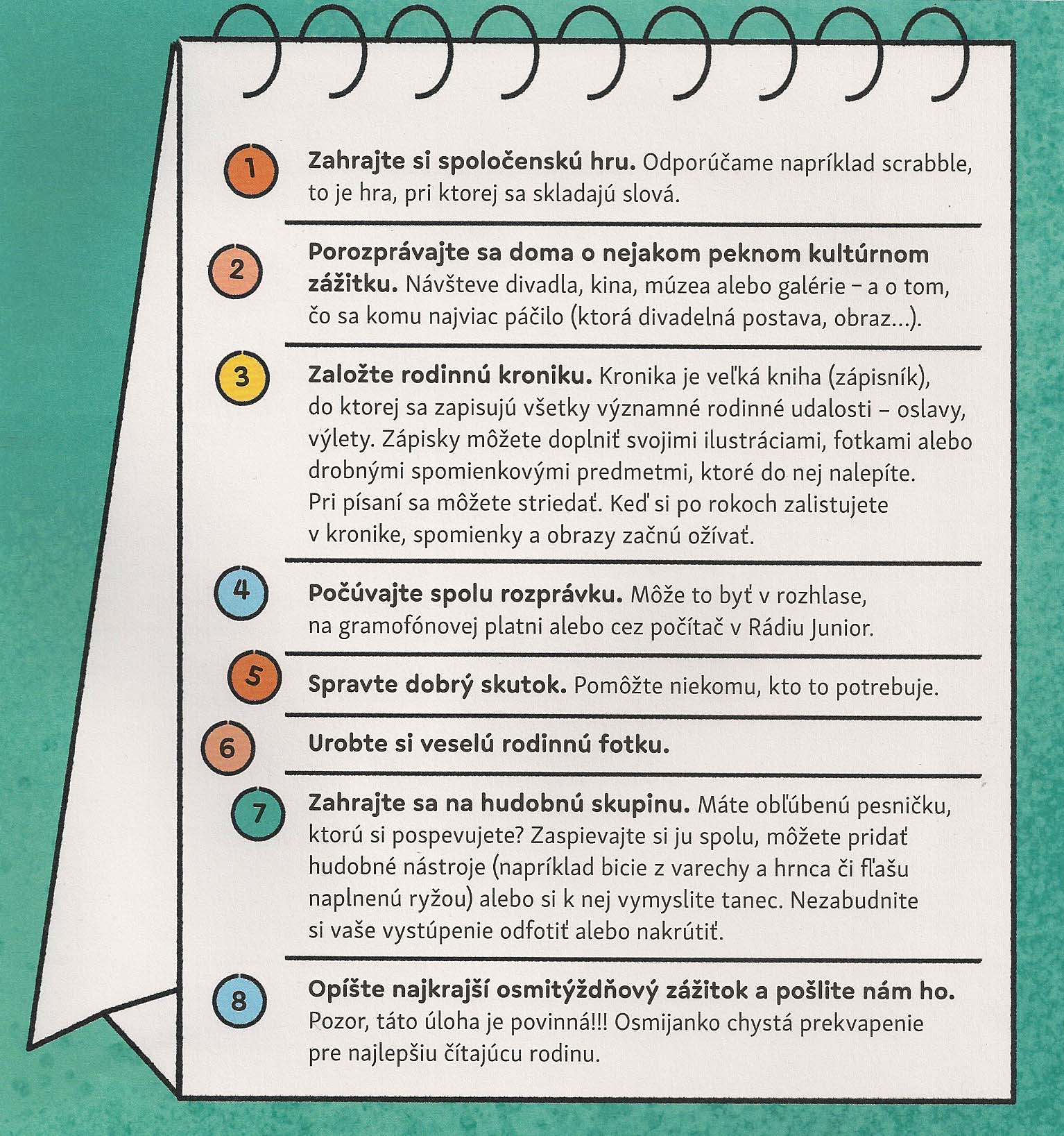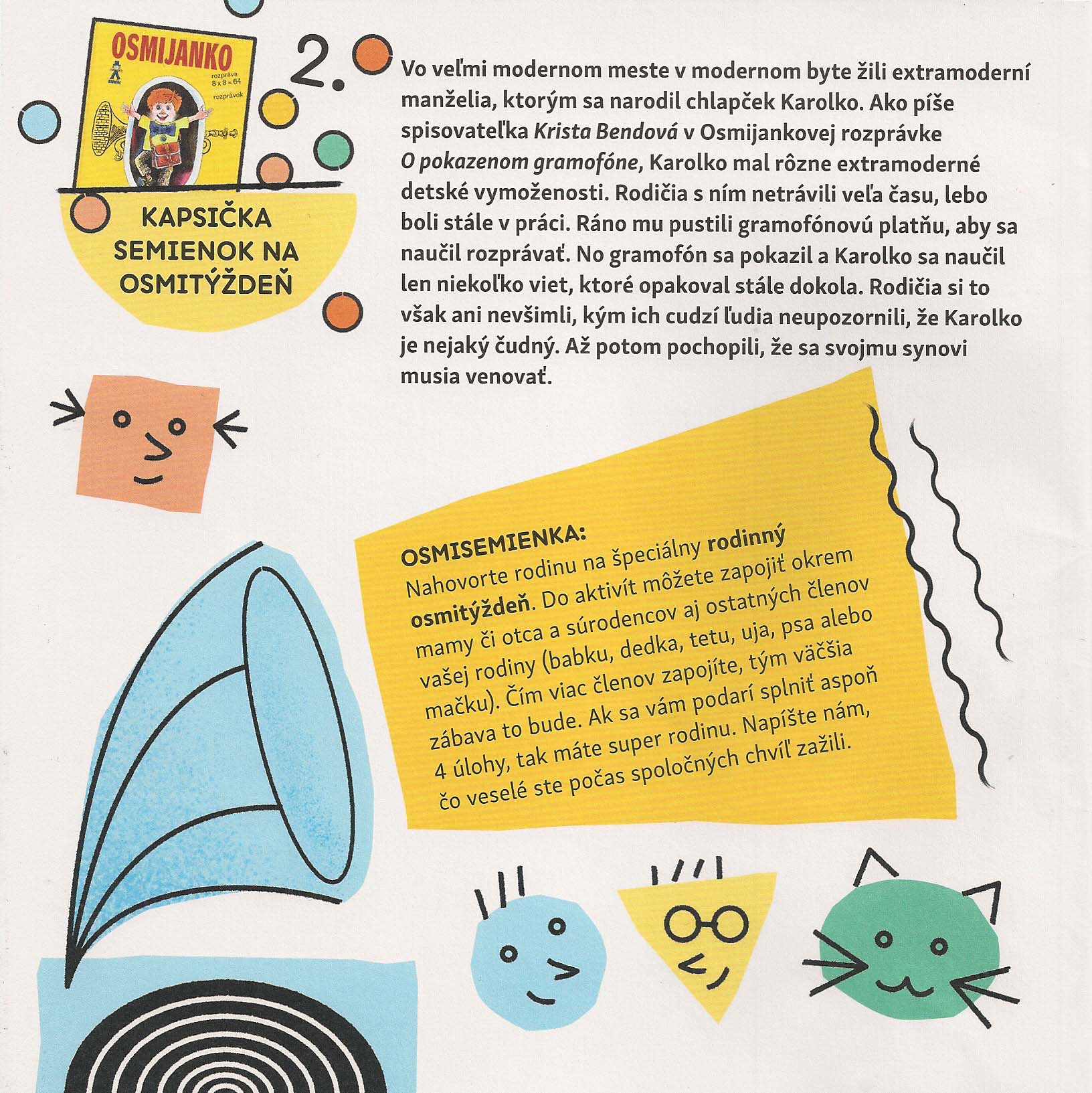 Pozývame vás do Osmijankovej literárnej záhrady. Zasaďte semienka z Osmijankových súťažných kapsičiek. Jednu kapsičku otvárame práve teraz pre všetkých, ktorí sú s deťmi doma – čítajte priložené obrázky zo súťažného zošita. Všetkých osem úloh - hier sa môžete s deťmi zahrať bez mimoriadnych nákladov: ak nemáte doma originálnu hru scrabble, tak si môžete vytvoriť vlastné kartičky so slovami, zaspomínať si na niektoré kultúrne podujatie, ktoré ste naposledy s deťmi navštívili nebude tiež zložité, aj na internete si môžete pozrieť galériu obrazov alebo sa zahrať na ilustrátorov. Rodinná kronika vám pomôže sprítomniť si vzácne chvíle z rodinného života. Počúvanie rozprávky, či rozhlasovej hry nemá žiadne obmedzenia takisto ako dobré skutky, sú v týchto chvíľach najcennejšie. Mobilmi fotíme dnes už takmer všetci, preto ani toto semienko zasadiť nebude problémom. Nie je nám do spevu? Premôžme svoje negatívne nálady a založme rodinný band.