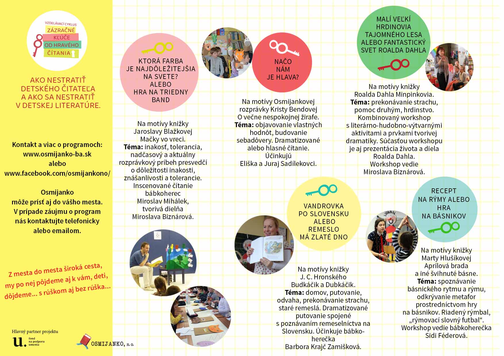 V rámci vzdelávacieho projektu sme pripravili workshopy na aktuálne i nadčasové témy, ktoré ponúka kvalitná detská knižná produkcia zo slovenských vydavateľstiev. Vzhľadom na situáciu na Slovensku v súvislosti s korona krízou sa realizujú online i naživo v rámci všetkých regiónov Slovenska.