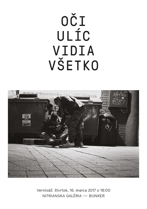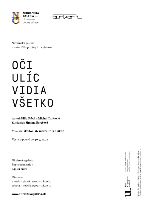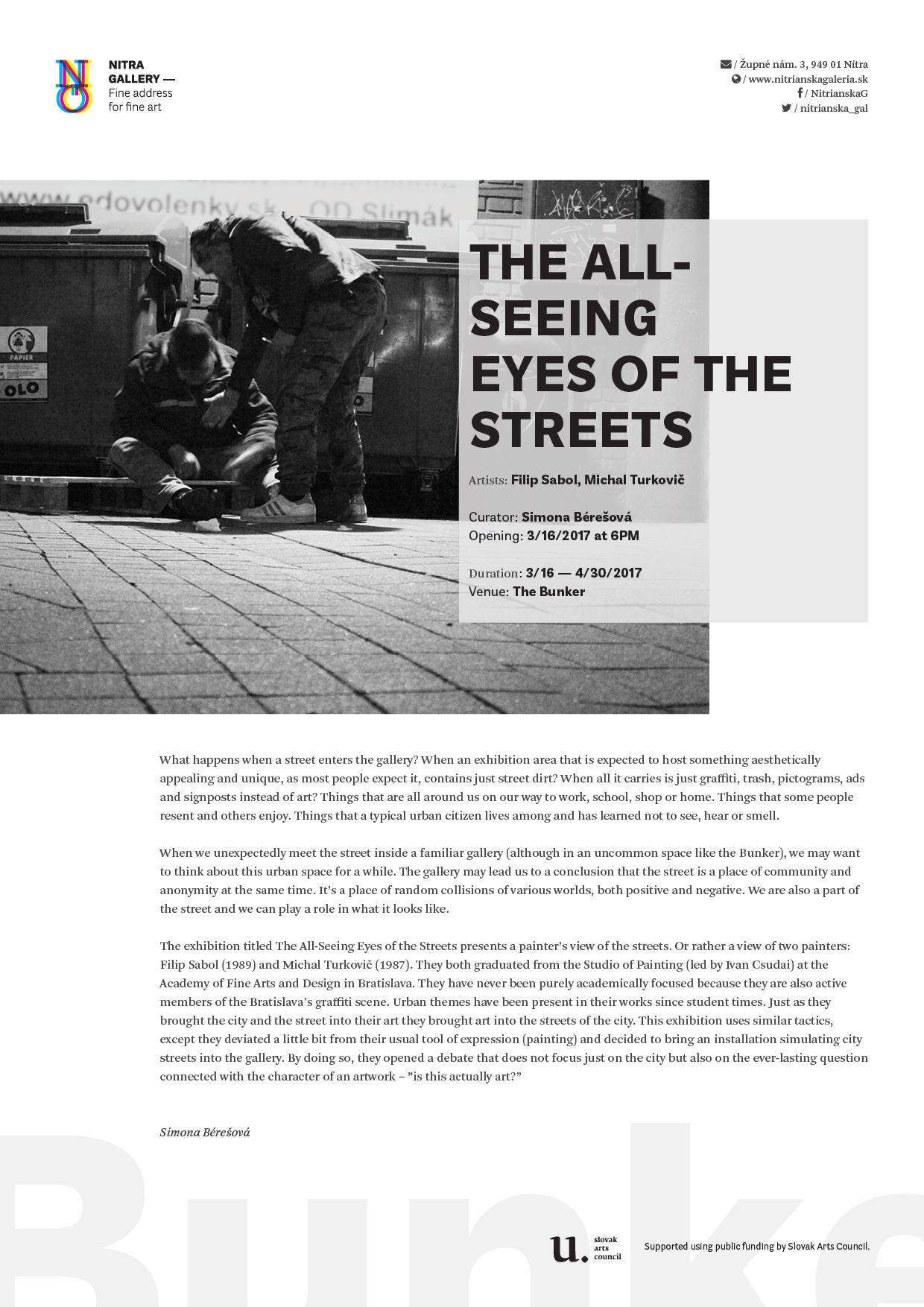 Výstava Oči ulíc vidia všetko predstavuje pohľad maliara na ulicu. Lepšie povedané dvoch maliarov, Filipa Sabola (1989) a Michala Turkoviča (1987). Obaja sú absolventmi ateliéru maľby Ivana Csudaia na VŠVU v Bratislave, no nikdy sa nepohybovali iba v akademickom prostredí, ale sú aj aktívnou súčasťou bratislavskej gra ti scény. Urbánne témy sa v ich tvorbe objavujú už od študentských čias: tak ako mesto a ulicu vnášali do svojho umenia, tak aj umenie vnášali do ulíc mesta. Podobnú stratégiu si zvolili aj pri tejto výstave, v rámci ktorej sa však odpútali od pre nich charakteristickej maliarskej praxe, a miesto umenia priniesli do galérie inštaláciu evokujúcu mestské ulice. Otvárajú tým polemiku zameranú nielen na mesto, ale aj na charakter umeleckého diela, a večnú otázku „je toto umenie?“
