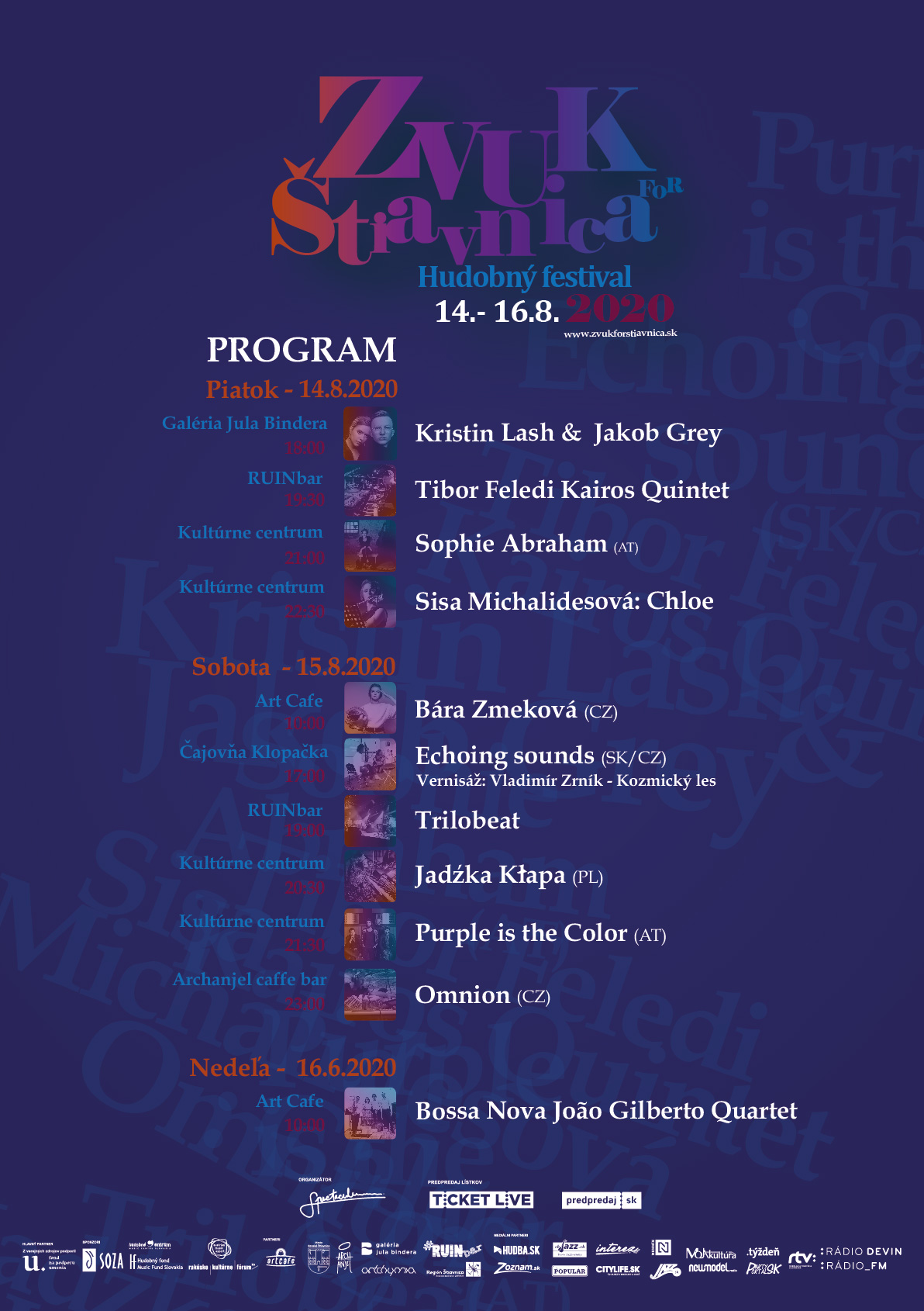 Festival plný sviežej mladej energie ostáva naďalej medzinárodný. Hudobníci tento rok do Banskej Štiavnice pricestujú až z piatich krajín. Okrem slovenskej bude mať svojich zástupcov mladá česká, rakúska, poľská či maďarská scéna. Spolu s návštevníkmi budeme objavovať cez ZVUKY (nielen) jazzu nové štiavnické priestory. Už k tradičnému Kultúrnemu centru, Art Cafe a Čajovni Klopačka sa pridá Galéria Jula Bindera a RUINbar.