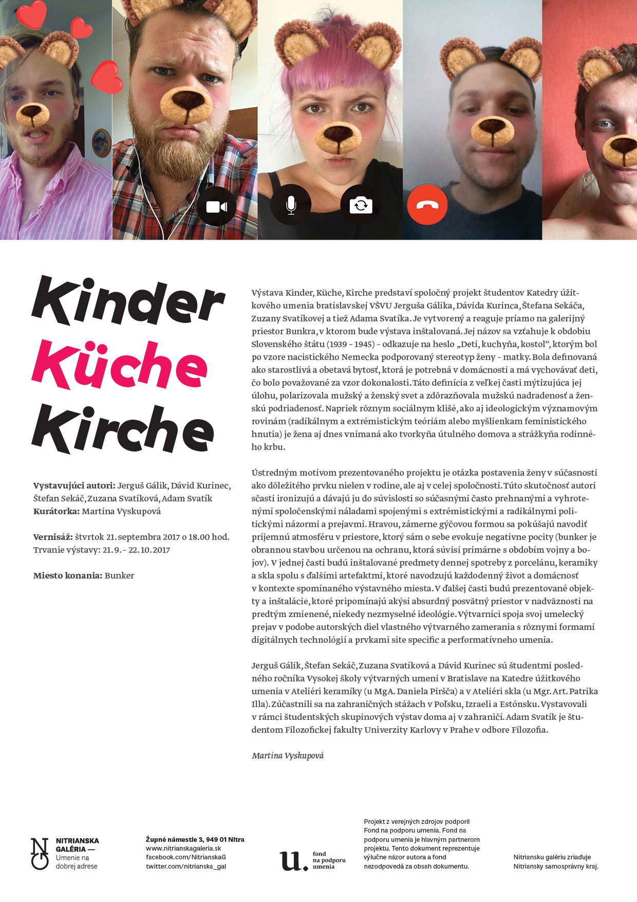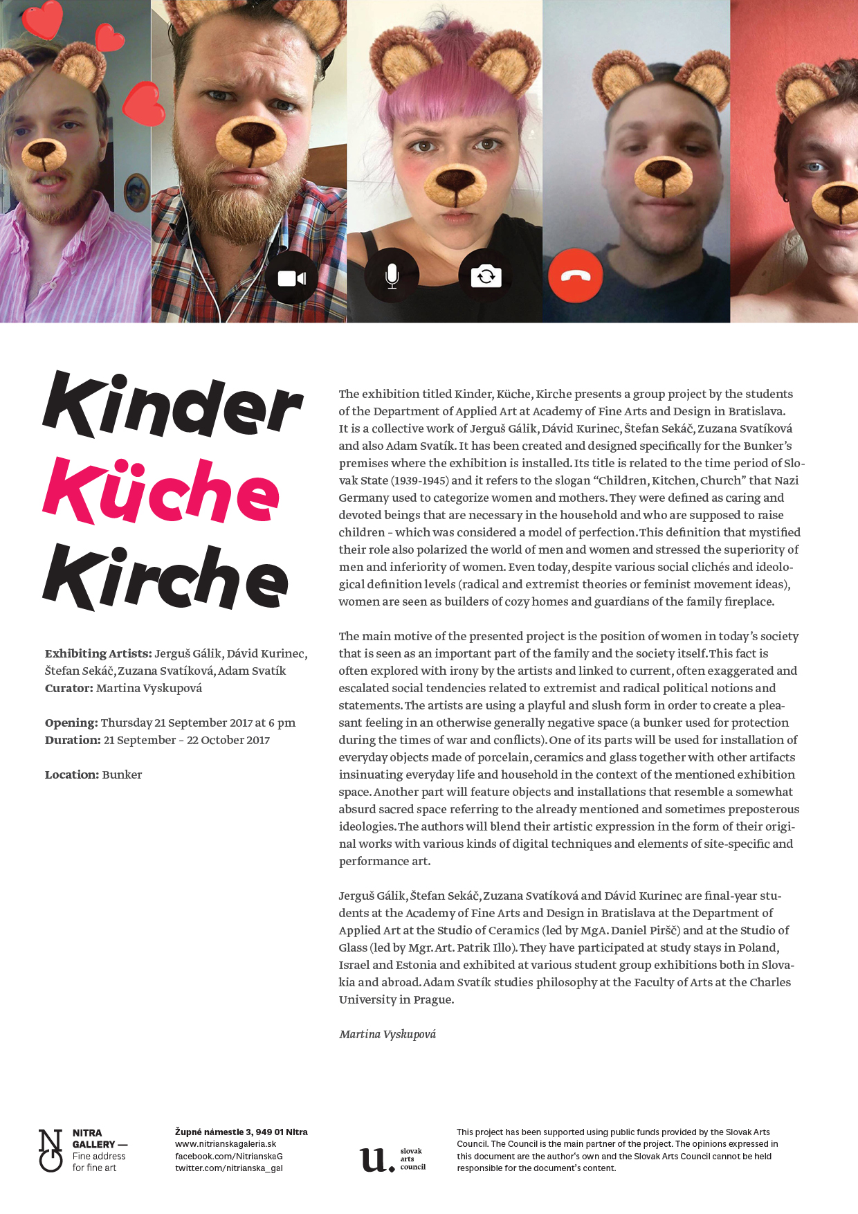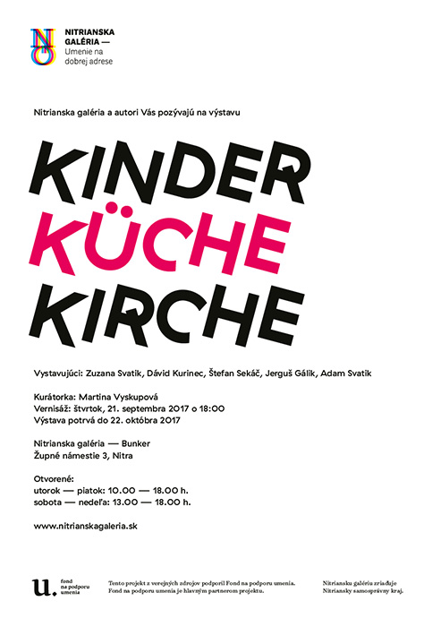 Výstava Kinder, Küche, Kirche predstaví spoločný projekt študentov Katedry úžitkového umenia bratislavskej VŠVU Jerguša Gálika, Dávida Kurinca, Štefana Sekáča, Zuzany Svatíkovej a tiež Adama Svatíka. Je vytvorený a reaguje priamo na galerijný priestor Bunkra, v ktorom bude výstava inštalovaná. Jej názov sa vzťahuje k obdobiu Slovenského štátu (1939 – 1945) – odkazuje na heslo „Deti, kuchyňa, kostol“, ktorým bol po vzore nacistického Nemecka podporovaný stereotyp ženy – matky. Bola definovaná ako starostlivá a obetavá bytosť, ktorá je potrebná v domácnosti a má vychovávať deti, čo bolo považované za vzor dokonalosti. Táto definícia z veľkej časti mýtizujúca jej úlohu, polarizovala mužský a ženský svet a zdôrazňovala mužskú nadradenosť a ženskú podriadenosť. Napriek rôznym sociálnym klišé, ako aj ideologickým významovým rovinám (radikálnym a extrémistickým teóriám alebo myšlienkam feministického hnutia) je žena aj dnes vnímaná ako tvorkyňa útulného domova a strážkyňa rodinného krbu.