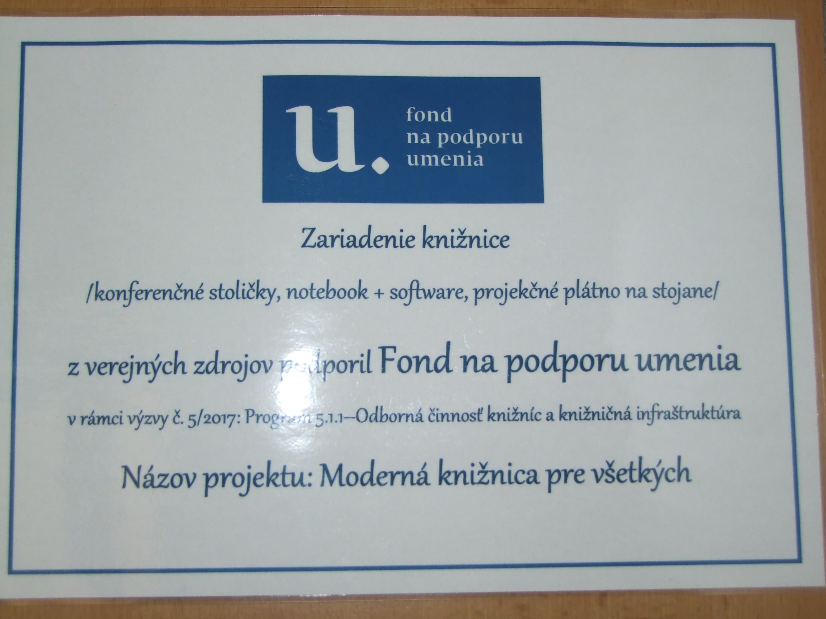 Kurz z verejných zdrojov podporil FOND NA PODPORU UMENIA nákupom premietacieho plátna na stojane, notebooku včetne softwaru microsoft office a konferenčných stoličiek.